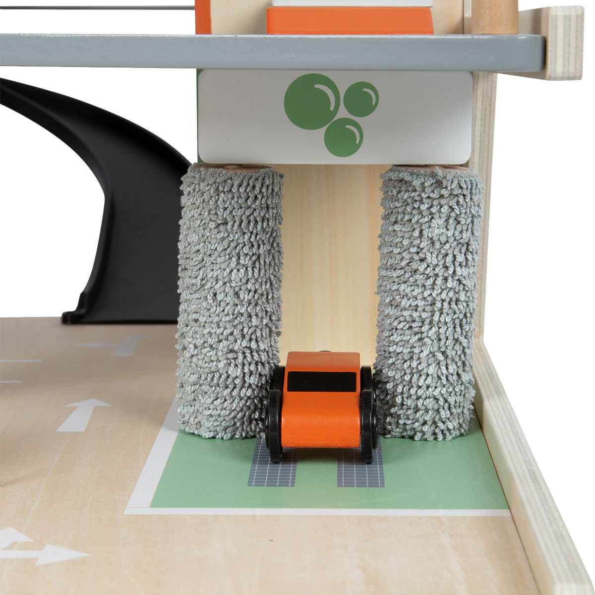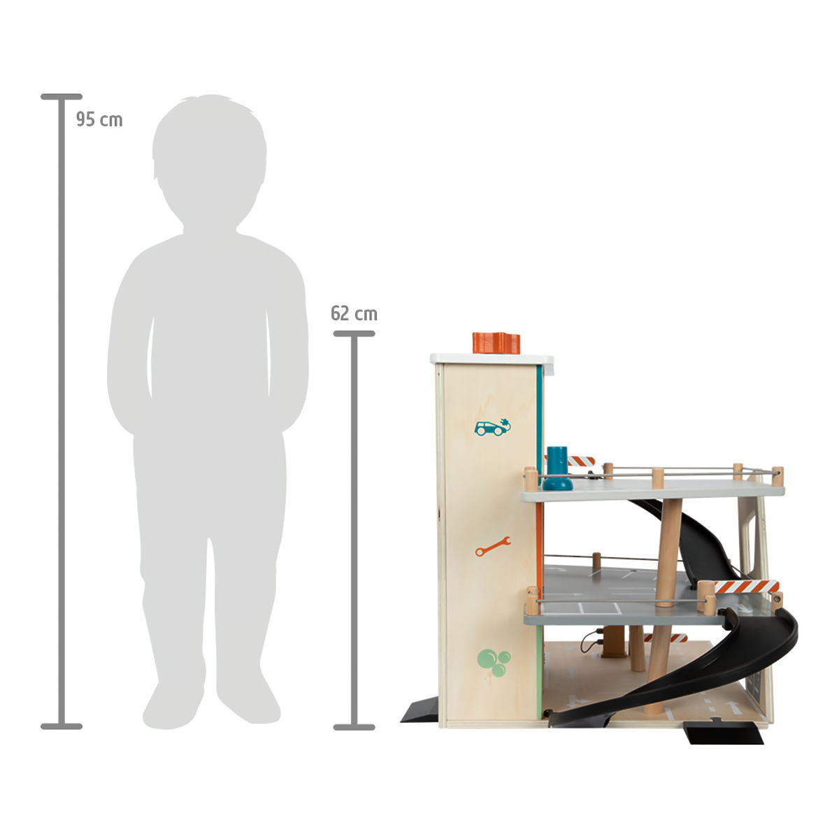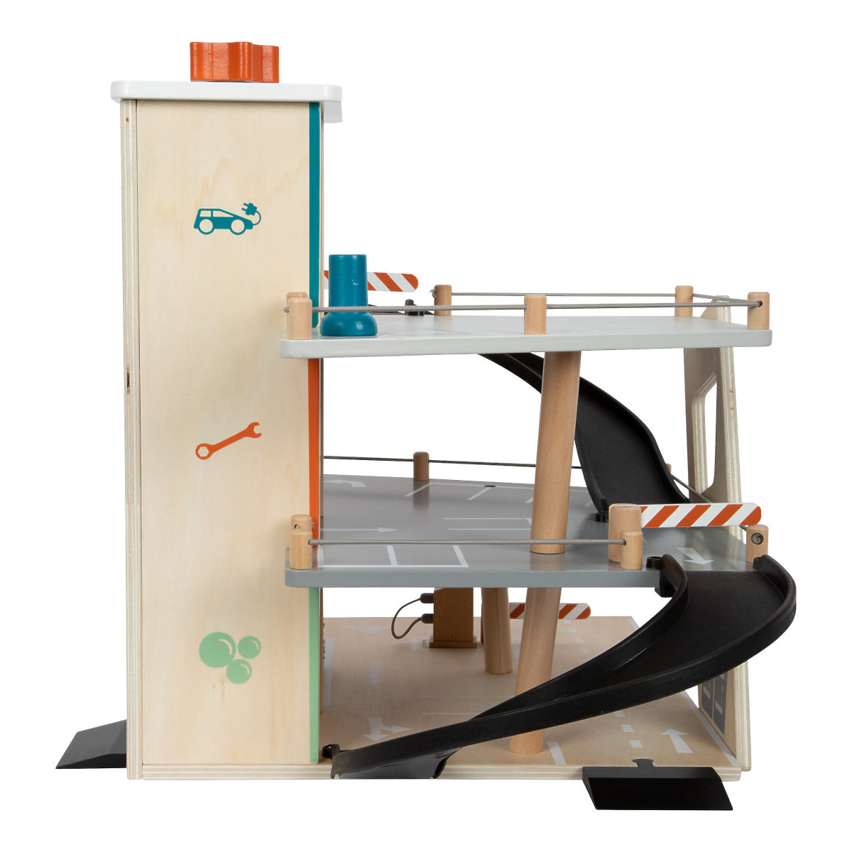 Das Video ist nur illustrativ und zeigt ein verwandtes Produkt. Parken, tanken, waschen oder reparieren – alles mit einer Garage! Sie bietet drei reich ausgestattete Etagen, die durch einen attraktiven, funktionalen Aufzug und unterhaltsame, nahtlos ineinander übergehende Rampen verbunden sind. Teil der Ausstattung sind zwei Autos, die bei fantastischen Spielen die Tankstelle, Ladestation, Hebebühne oder Waschstraße mit realistischen Bürsten nutzen können. Jede Ebene ist zudem mit einer mechanischen Schranke für besonders fesselnde Erlebnisse ausgestattet. Die Etagen sind mit Gummileisten versehen, die den Fahrspaß der Autos dynamischer machen und ein Herausfallen verhindern. Die Garage ist detailliert mit vielen bunten Symbolen und Markierungen verziert, die auch lehrreiche Elemente ins Spiel bringen. Sie besteht aus starkem, robustem und langlebigem Holzsperrholz mit Ergänzungen aus Massivholz und unbedenklichem Kunststoff. Das Produkt erfordert Montage und wird mit einer bebilderten Aufbauanleitung geliefert. Hauptmerkmale: Garage und 2 Autos, 3 Etagen verbunden durch einen funktionalen Aufzug und 2 Rampen, Tankstelle, Ladestation, Hebebühne, Waschstraße und 3 Schranken, kompatibel mit Eisenbahnschienen und Zubehör anderer Hersteller, reich verziert mit einfachen Symbolen und Markierungen, robustes und langlebiges Holzdesign.