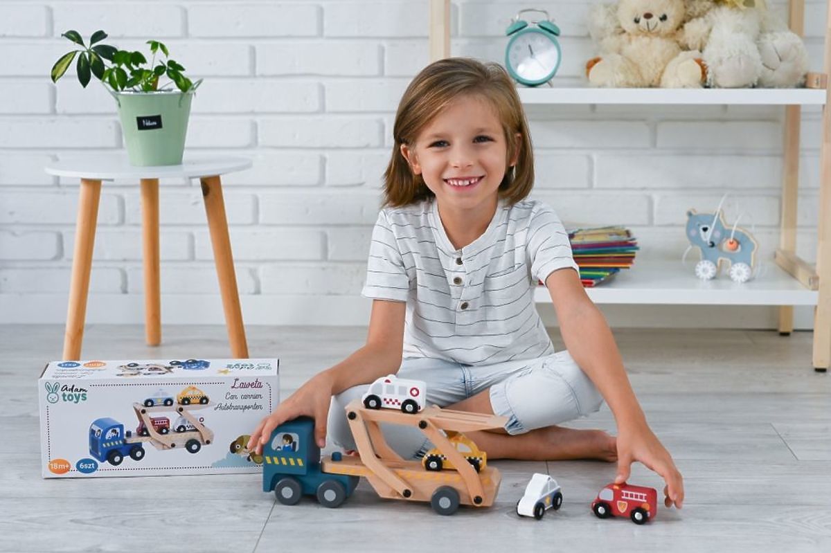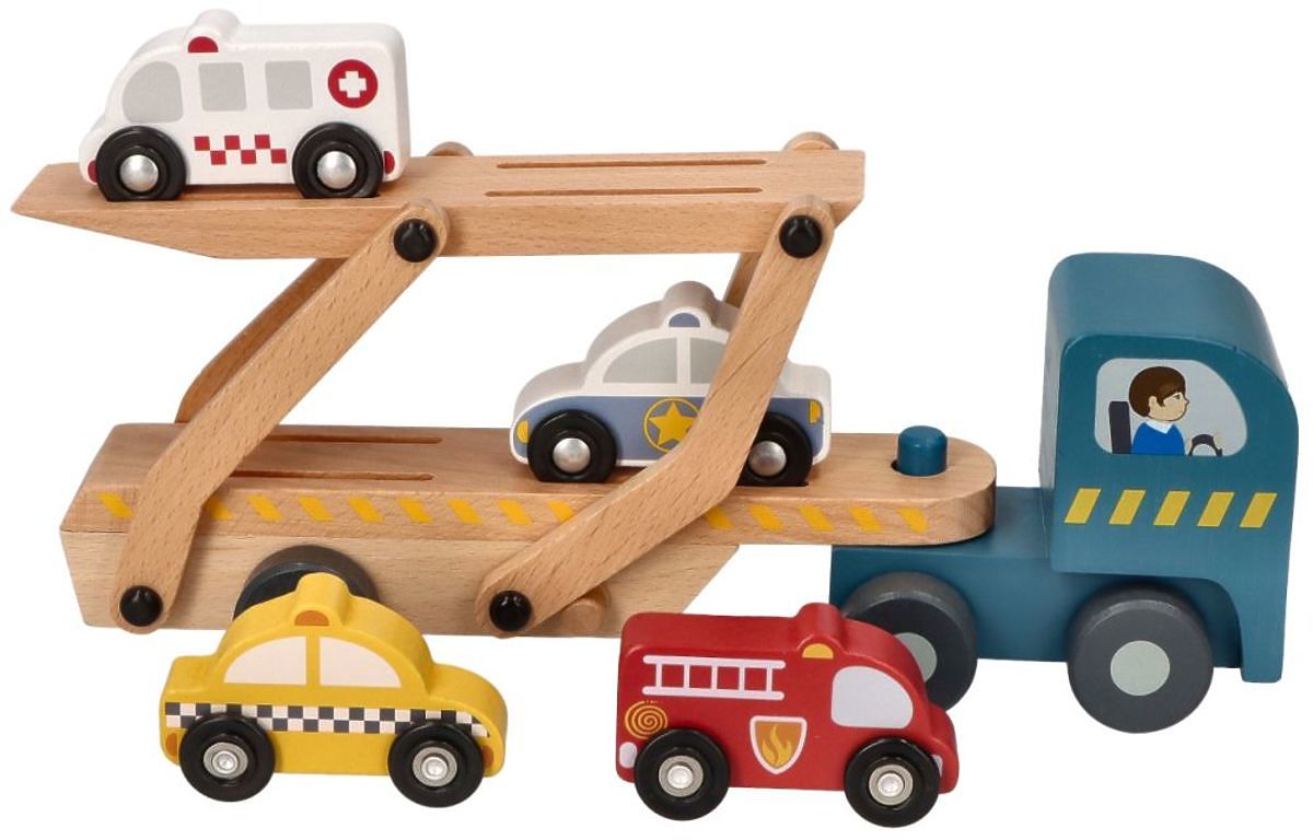Der Transporter besteht aus zwei klappbaren Ebenen. Die obere Platte kann abgesenkt werden, um eine Rampe zu bilden, auf der die Autos hinunterfahren können. Zum Set gehören auch vier bunte Holzautos. Der Transporter ist auf einem Stift montiert, wodurch der hintere Teil beweglich ist und lenken kann. Der Transporter kann auch abgekoppelt werden, sodass nur mit dem Lastwagen - dem Zugfahrzeug - gefahren werden kann. Dieses Fahrzeug bietet viele Spielmöglichkeiten.