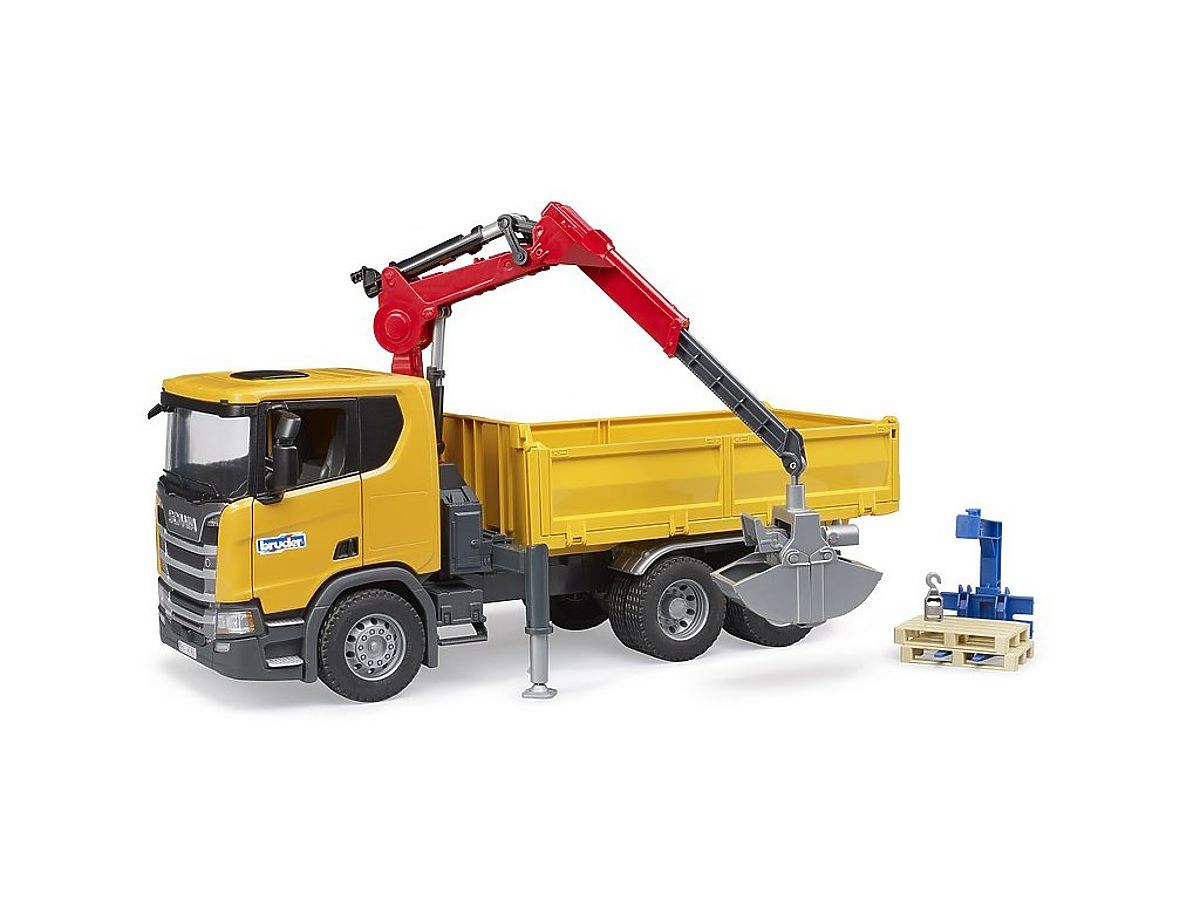 Wie die anderen Scania-Modelle zeichnet sich auch dieses durch seine Robustheit und Widerstandsfähigkeit aus. Der LKW verfügt über zu öffnende Türen, klappbare Spiegel und ist sowohl für das Spielen zu Hause als auch im Gelände geeignet. Die Fahrerkabine dieses Fahrzeugs bietet allen Figuren aus der bworld-Welt einen komfortablen Arbeitsplatz. Hinter der Kabine befindet sich ein teleskopischer Ladekran, der um 360° drehbar ist. Für einfacheres Be- und Entladen sind die Bordwände klappbar und die Ladefläche ist absenkbar. Die Stabilität des Fahrzeugs wird durch Stützfüße gewährleistet. Im Lieferumfang sind zwei Paletten, Palettengabeln und ein Greifer mit Schaufel enthalten. Hauptmerkmale: klappbare Spiegel, zu öffnende Türen, Kranarm um 360° drehbar, klappbare Bordwände, Stützfüße, absenkbare Ladefläche, geeignet für das Spielen zu Hause und draußen, kompatibel mit BRUDER bworld-Figuren, hergestellt in Deutschland, geeignet ab 4 Jahren