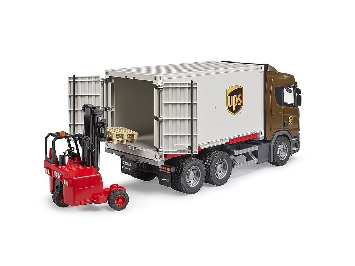 Der Scania der R-Serie hat drei Achsen, öffnende Türen und klappbare Spiegel. Im Lieferumfang enthalten sind ein abnehmbarer Container, zwei Paletten und ein voll funktionsfähiger Gabelstapler. Der leicht zerlegbare Container ist mit hinteren Klapptüren ausgestattet. Stützfüße erleichtern das Be- und Entladen, wodurch der Container problemlos vom Fahrzeug getrennt werden kann. Durch Herausziehen und Ausfahren der Stützen hebt sich der Container an und das Lastfahrzeug kann sich vom Container entfernen. Für mehr Spielspaß kann dem Fahrzeug ein Licht- und Soundmodul (Code BR2801) hinzugefügt werden. Hauptmerkmale: öffnende Türen klappbare Spiegel Stützfüße abnehmbarer Container hintere Klapptüren des Containers Profilreifen hergestellt in Deutschland geeignet ab 2 Jahren