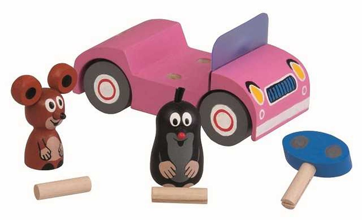 Holzauto mit dem kleinen Maulwurf und Maus im rosa Design. .. mehr