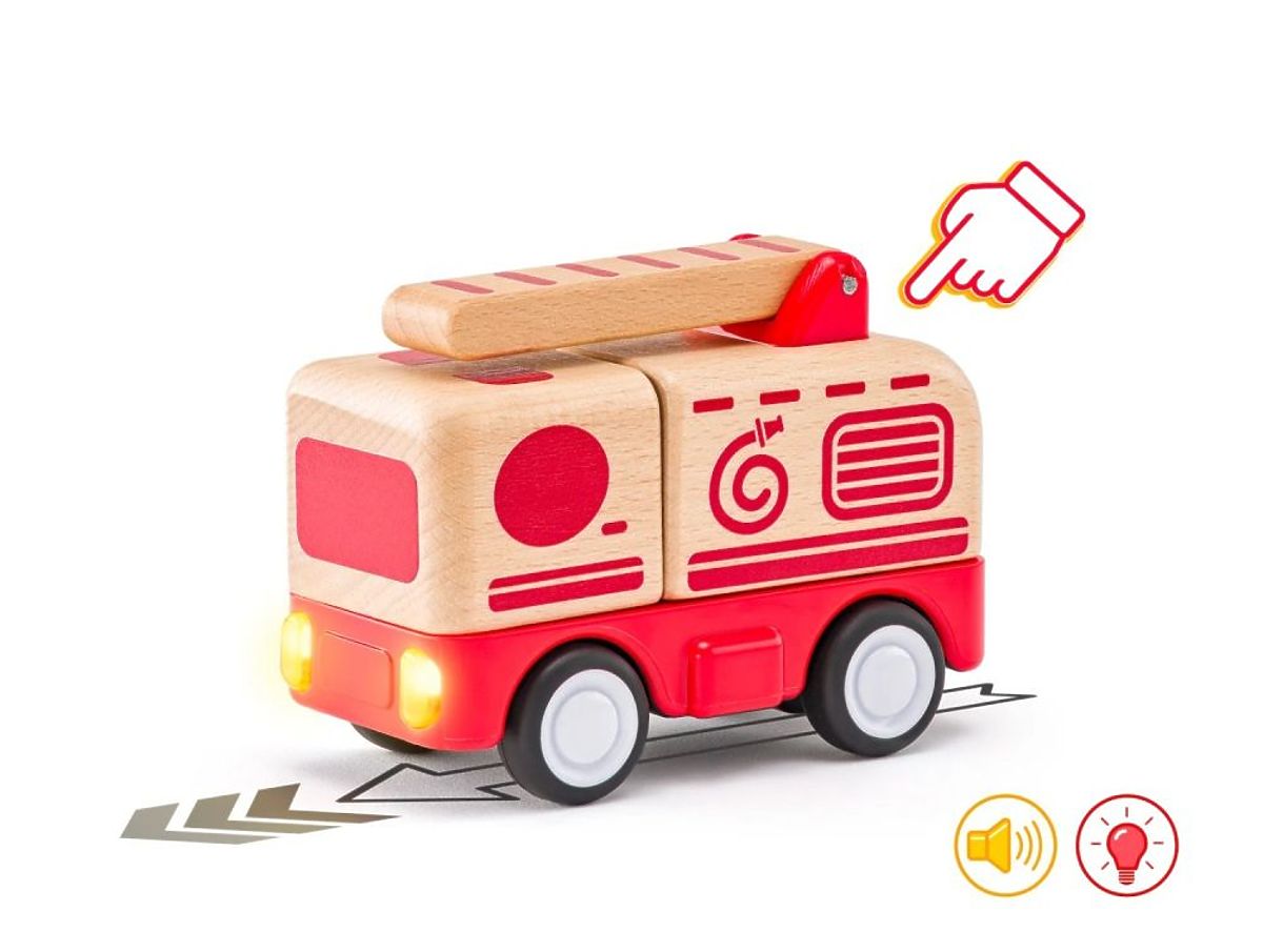 Die neue Fahrzeugkollektion der Marke Woody sind Autos, die in ihrer Größe an kleine Hände angepasst sind. Hergestellt aus Holz mit Plastikelementen und mit kindersicheren Farben bemalt. Sie haben weiche Gummireifen, die für guten Halt auf der Oberfläche sorgen. Beim Drücken des Autos leuchten die Lichter auf, wir hören ein Signal und das Fahrzeug beginnt zu fahren.