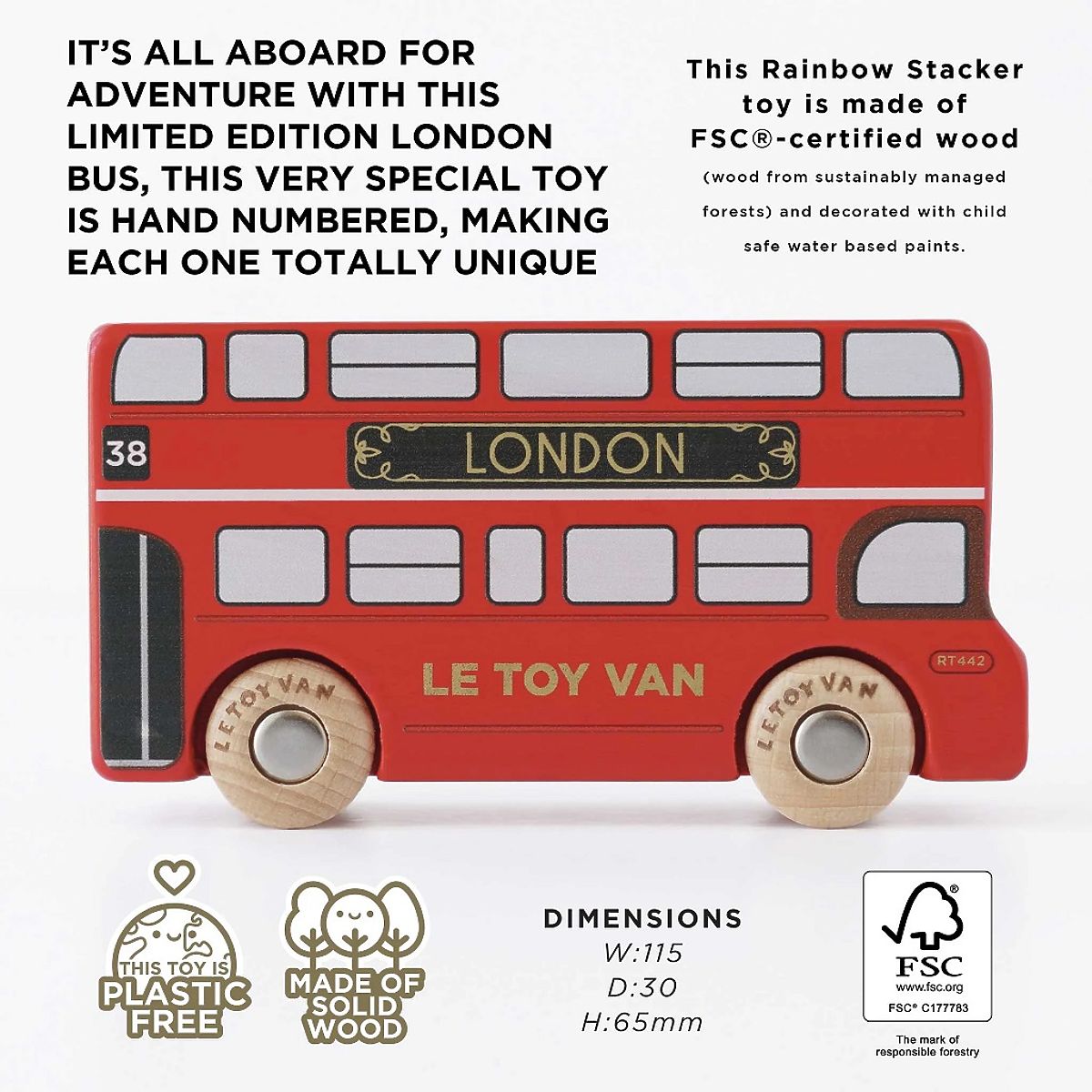 Begeben Sie sich auf ein Abenteuer mit der limitierten Edition des Londoner Busses! Dieses Spielzeug aus robustem Holz wird in Großbritannien hergestellt und von Hand nummeriert - jedes Stück ist absolut einzigartig! Lackiert in traditionellem Rot mit eleganten goldenen Details und robusten Rädern, ist es mit allen Garagen und Eisenbahnen der Le Toy Van-Serie kompatibel. Der Bus besteht aus FSC®-zertifiziertem Holz (Holz aus nachhaltig bewirtschafteten Wäldern) und ist mit kinderfreundlichen, wasserbasierten Farben verziert. Spielzeug mit ZweckAlle Spielzeuge von Le Toy Van sind darauf ausgelegt, lange zu halten. Sie werden mit Liebe von erfahrenen Handwerkern unter Verwendung ethischer Praktiken und nachhaltiger Materialien entworfen, die schonender für unseren Planeten sind. Hauptmerkmale: ethisch aus FSC-nachhaltigem Holz hergestelltbemalt mit ungiftigen, wasserbasierten Farbennach den strengsten Standards getestete limitierte Edition handnummerierter Busse (nur 1000 Stück weltweit)klassisches Vintage-Rot-Designhergestellt in Großbritannien Autos & Bauten: Die Bau- und Fahrzeugkollektion von Le Toy Van, die viele Auszeichnungen gewonnen hat. Genauer gesagt, bisher über 15 Auszeichnungen für fantasievolle Fahrzeuge und Bauspielzeuge. Sie fördern die kindliche Fantasie, sind ideal für fantasievolles Spiel, entwickeln Kreativität und verbessern spielerisch die Hand-Auge-Koordination der Kinder. Das FSC®-Label (Forest Stewardship Council) garantiert, dass das Holz, aus dem das Produkt hergestellt wurde, nicht illegal geschlagen wurde und aus Wäldern stammt, die schonend oder naturnah bewirtschaftet werden, wobei strenge Umwelt- und Sozialanforderungen eingehalten werden. Das FSC®-Label auf dem Produkt bedeutet, dass Sie durch Ihren Kauf helfen, Wälder zu schützen und eine schonende, verantwortungsvolle oder naturnahe Bewirtschaftung zu unterstützen, durch die unsere Wälder stabiler, gesünder, eine natürliche Artenzusammensetzung haben und besser gegen die negativen Folgen des Klimawandels gewappnet sind.