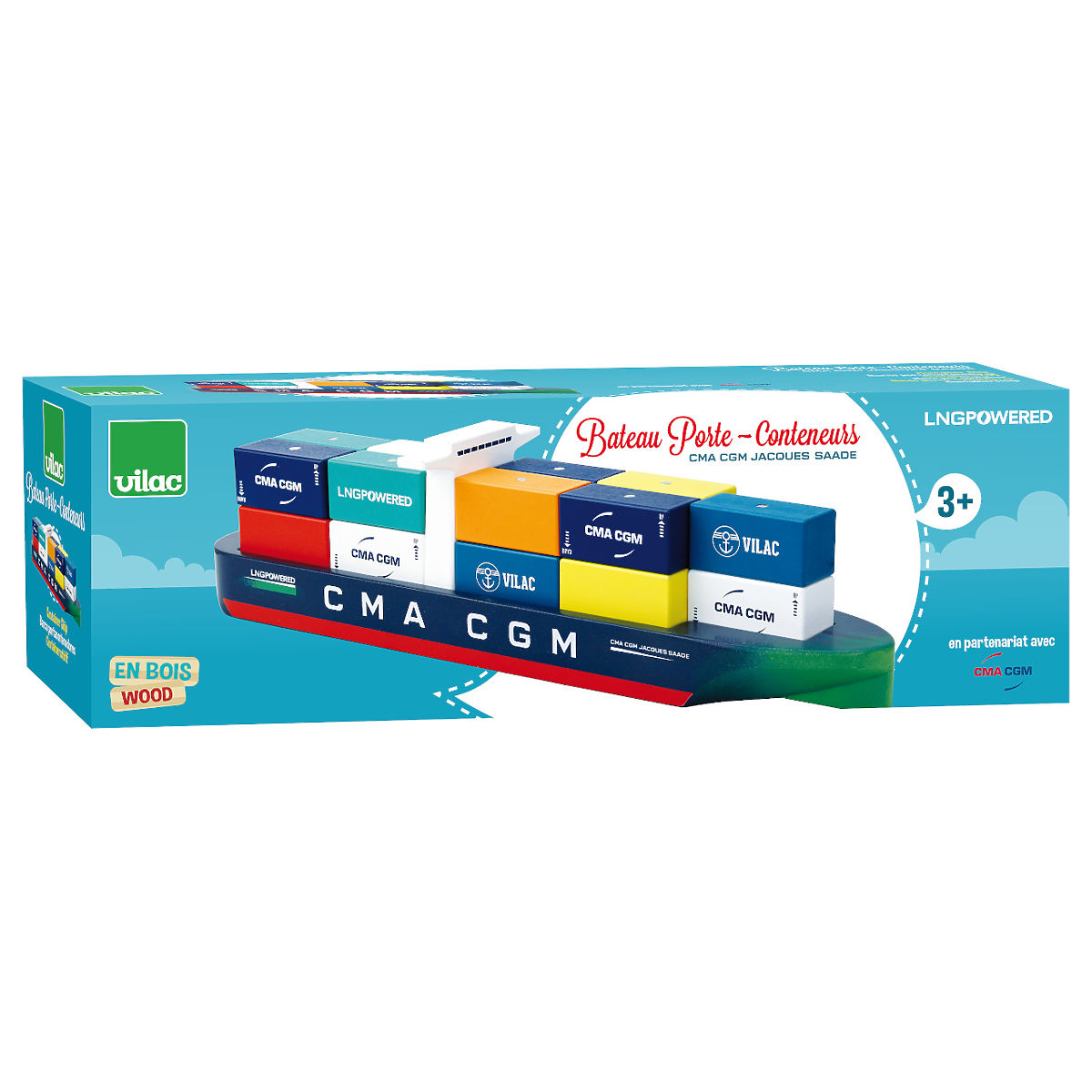 Das bunte Holzfrachtschiff mit magnetischen Containern ist eine Nachbildung des Schiffs Jacques Saadé, des ersten Schiffs, das Flüssigerdgas (LNG) als Antrieb nutzt. Das Spielzeug wurde in Zusammenarbeit mit dem führenden französischen Transportunternehmen CMA CGM hergestellt. Es ist Teil der Vilacity-Kollektion und vollständig mit all ihren Komponenten kompatibel. Weitere separate Erweiterungen bieten Variabilität und vertiefen das Spielerlebnis. Hauptmerkmale: Schiff und 18 Container, magnetische Verbindungen, kompatibel mit allen Komponenten der Vilac Vilacity-Kollektion, umweltfreundlich hergestellt, umweltschonend. V2357 – Hafenkran Vilacity (nicht im Set enthalten, in unserem Angebot erhältlich): V2358 – Lastwagen Vilacity (nicht im Set enthalten, in unserem Angebot erhältlich): Beispiel für den Aufbau des Schiffs mit weiteren Komponenten der Vilacity-Kollektion: