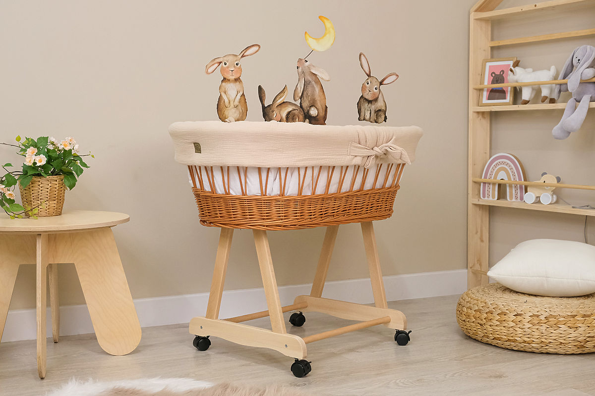 Weidenkörbchen mit Musselin-Bettwäsche und Rädern für Babys. .. mehr