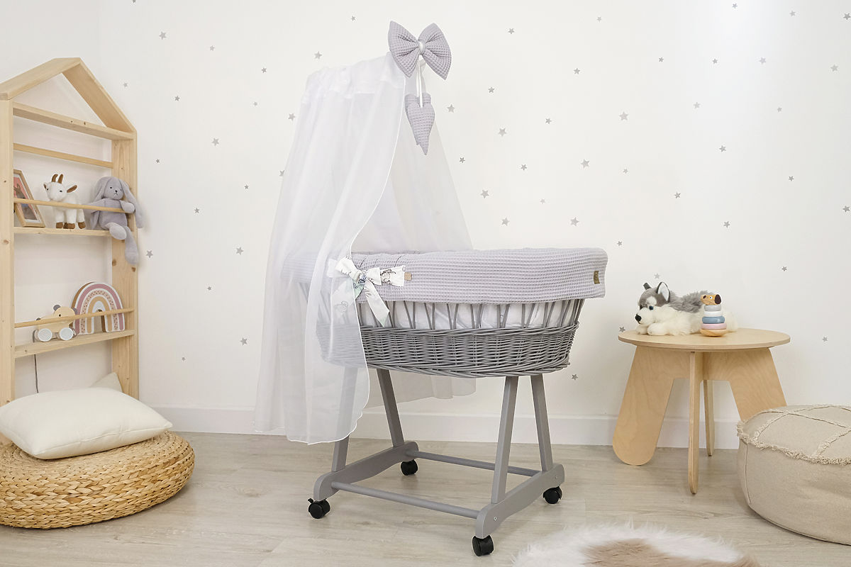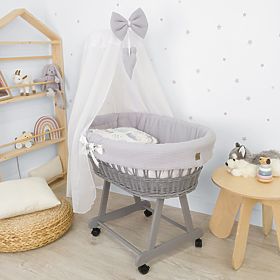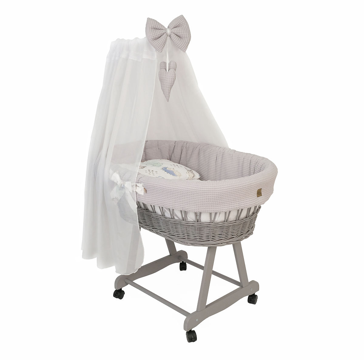 Dieses Weidenkörbchen schafft überall im Haus einen perfekten und gemütlichen Schlafplatz für Ihr Baby. Der graue Korb enthält ein 5-teiliges Bettwäscheset mit einem Igelmotiv und seinen Freunden aus attraktiver Waffelbaumwolle.