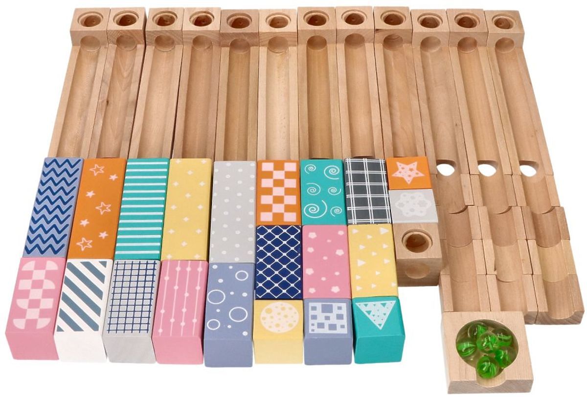 Ein fantastisches Spielzeug für die ganze Familie, das es ermöglicht, gemeinsam Zeit beim Bau immer neuer Konstruktionen zu verbringen. In diesem Fall sind die Elemente aus Holz und die Kugeln aus Glas, was die Haltbarkeit des Spielzeugs garantiert. Testen Sie Ihre Kreativität, indem Sie immer neue Strecken für die schnell rollenden Kugeln entwerfen.