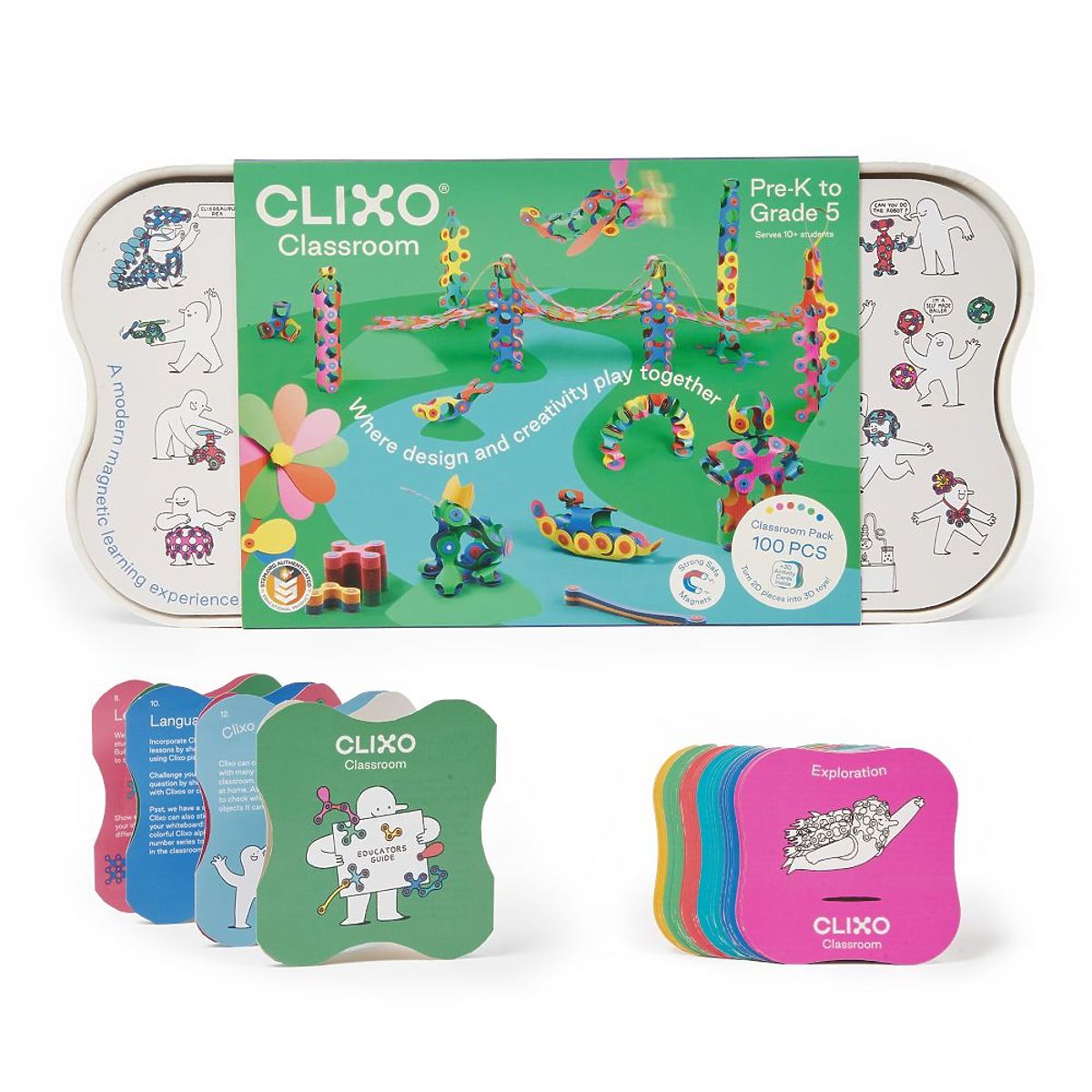 Wir präsentieren das große Set Classroom Pack - eine großartige Idee für kreative Workshops in der Schule oder im Kindergarten in einer größeren Gruppe. Dank der 100 Elemente, des Leitfadens und der 32 Aufgabenkarten wird das Erstellen eigener Konstruktionen zu einer noch größeren Herausforderung. Bunte, bewegliche Elemente und Bausätze in verschiedenen Formen bieten so viele Möglichkeiten für entwicklungsfördernden Spaß. Fördern Sie Kreativität und entwickeln Sie gleichzeitig Problemlösungsfähigkeiten und sensorische Erkundungen. Diese Bausätze ermöglichen stundenlangen Spielspaß.