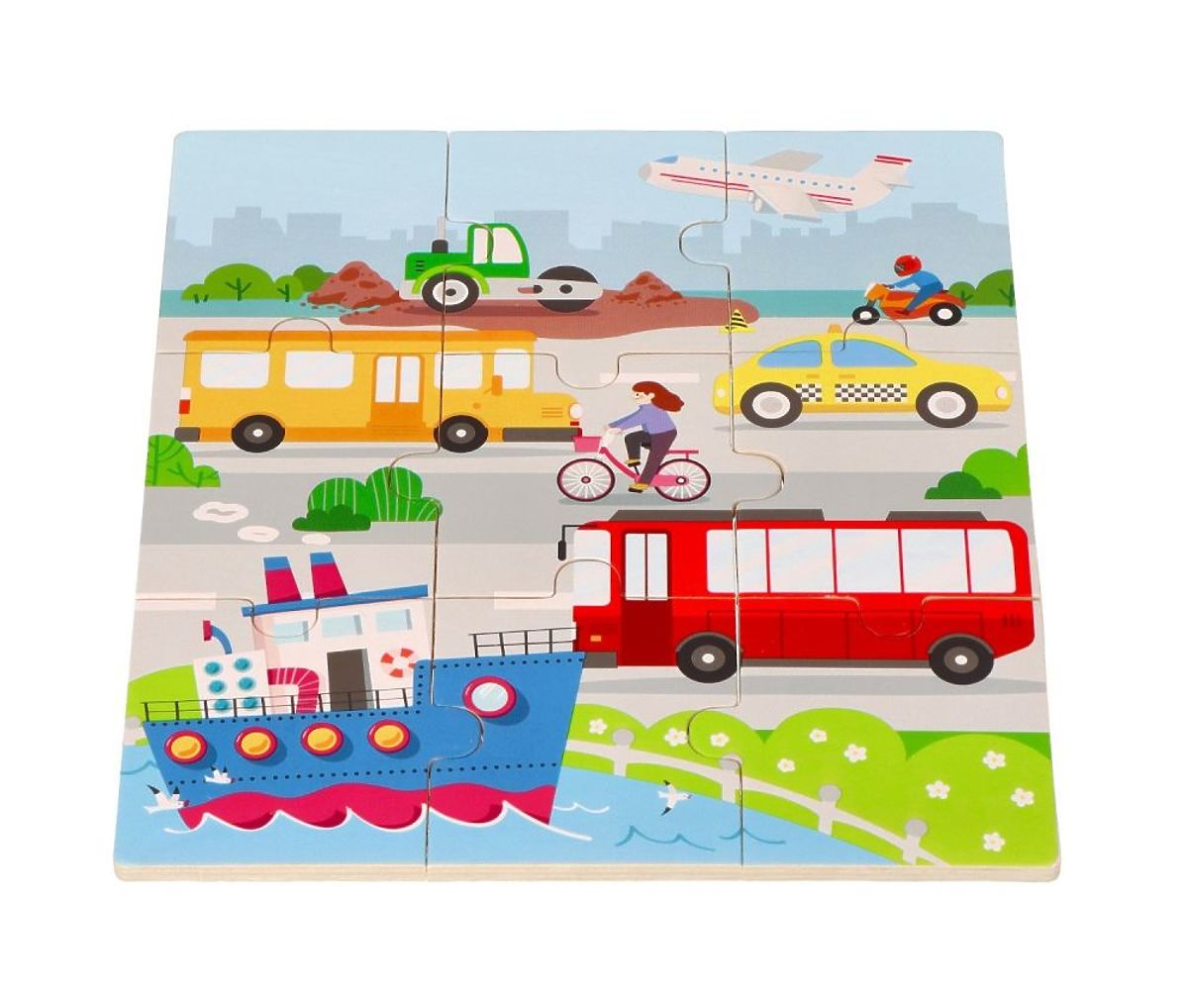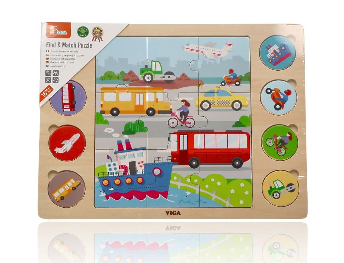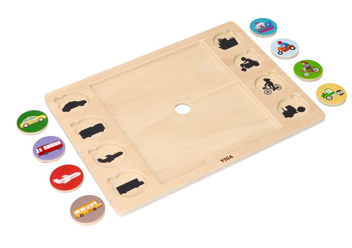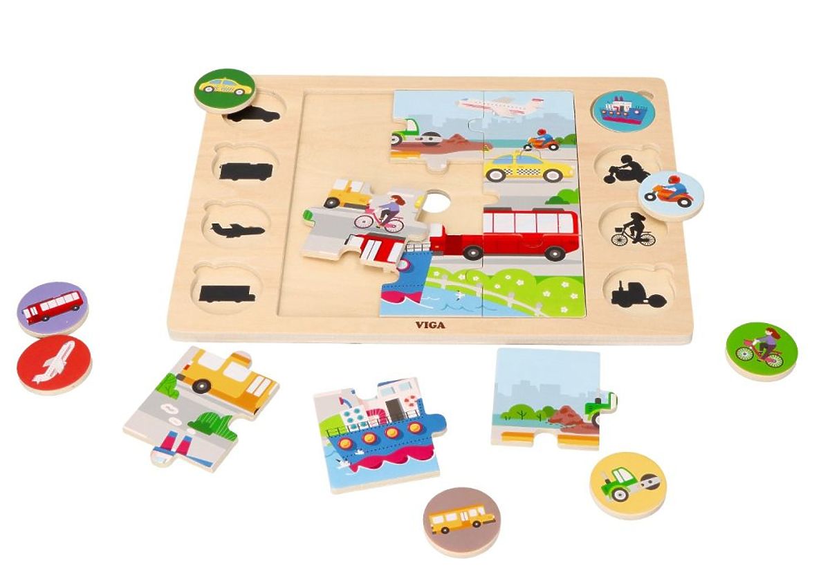 Das Spiel beginnt mit dem Zusammenbau eines 9-teiligen Puzzles in der Mitte. Danach kann das Kind 8 runde Puzzleteile den entsprechenden Schatten auf der Tafel anpassen. Diese Aufgabe fördert manuelle Fähigkeiten und Koordination, aber auch logisches Denken. Nach der korrekten Zuordnung aller Teile kann das Kind die einzelnen Fahrzeuge benennen und sie auf dem großen zusammengesetzten Bild finden. Es ist eine hervorragende Möglichkeit, den Wortschatz zu erweitern und logisches Denken zu entwickeln.