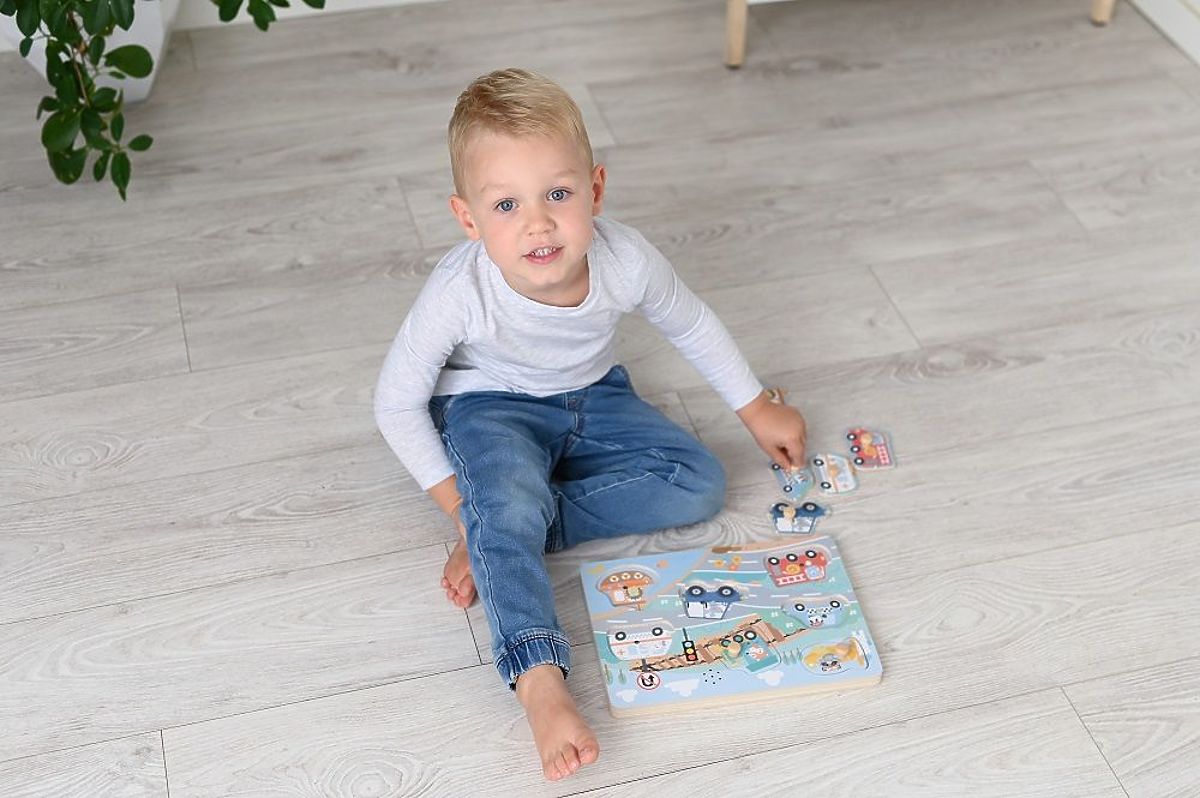 Wieder ein Musikpuzzle? Davon kann man nie genug haben! Diesmal ein Soundpuzzle der Marke Adam Toys, ein weiteres Angebot dieser Firma - neben Puzzles mit Motiven von Farmen, Safaris oder Werkzeugen. Diesmal lernen wir unsere Waldfreunde kennen, die verschiedene Fahrzeuge steuern. Die Aufgabe besteht natürlich darin, die Form des Tieres an der richtigen Stelle im Puzzle anzupassen. Wenn das Kind es richtig macht, hört es als Belohnung das Geräusch der Maschine, in der sich das Tier befindet, z.B.: Fuchs als Lokführer, Waschbär als Pilot oder Bär als Feuerwehrmann :)
