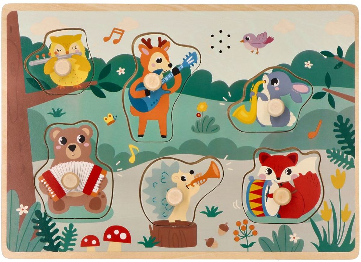 Ein weiteres Klangangebot von Adam Toys neben dem Bauernhof- und Safari-Puzzle. Diesmal lernen wir nicht nur Waldbewohner kennen, sondern auch die Klänge verschiedener Instrumente. Die Aufgabe besteht natürlich darin, die Form des Tieres an die richtige Stelle im Puzzle anzupassen. Wenn es richtig gemacht wird, hört man als Belohnung den Klang des Instruments, auf dem jedes der Tiere spielt. Dieses pädagogische Spielzeug fördert hervorragend die kindliche Vorstellungskraft, lehrt Konzentration und Beobachtungsfähigkeiten. Das Kind übt auch manuelle Fähigkeiten, insbesondere die Finger, und der Klang ermutigt zusätzlich zum Spielen.