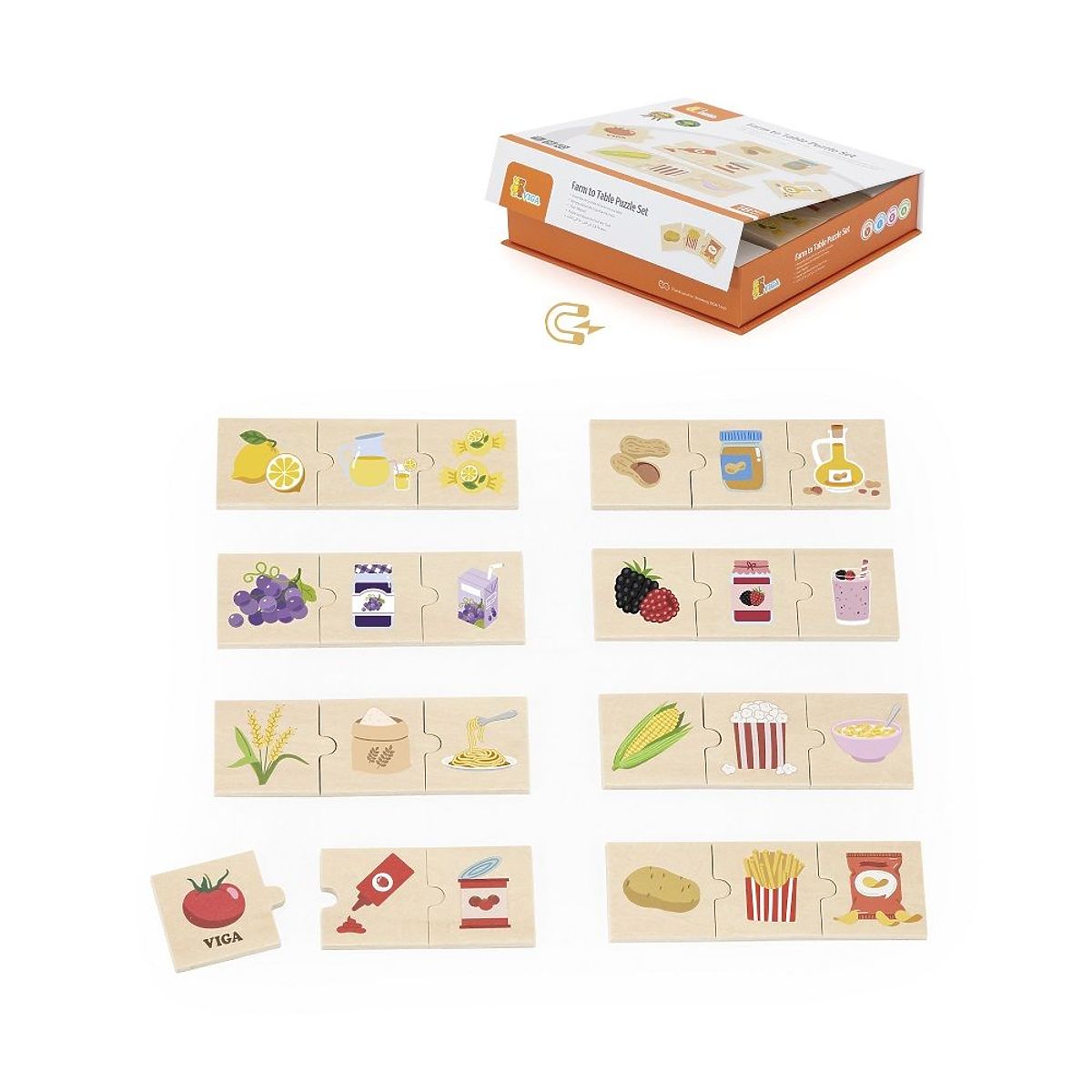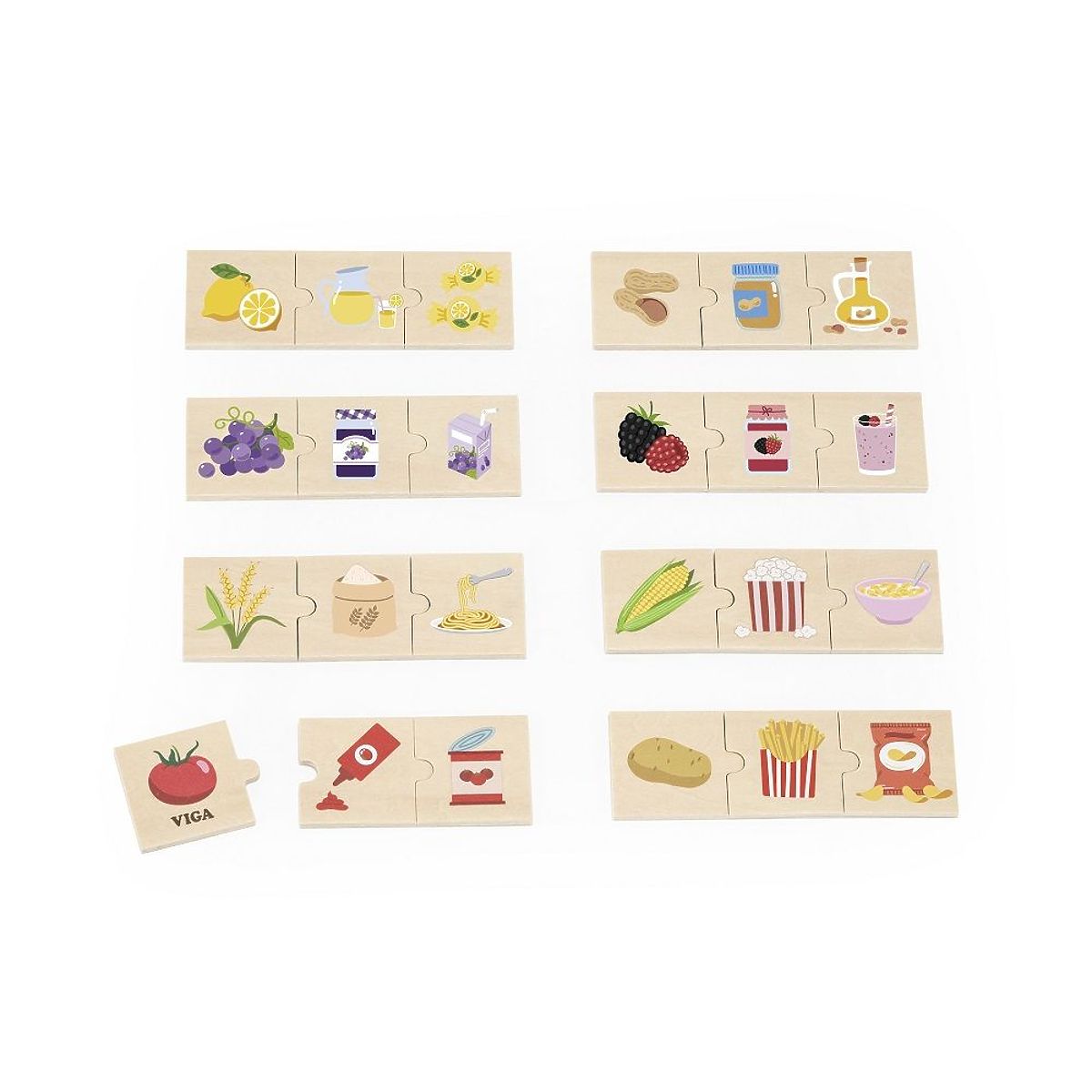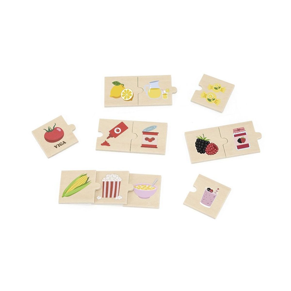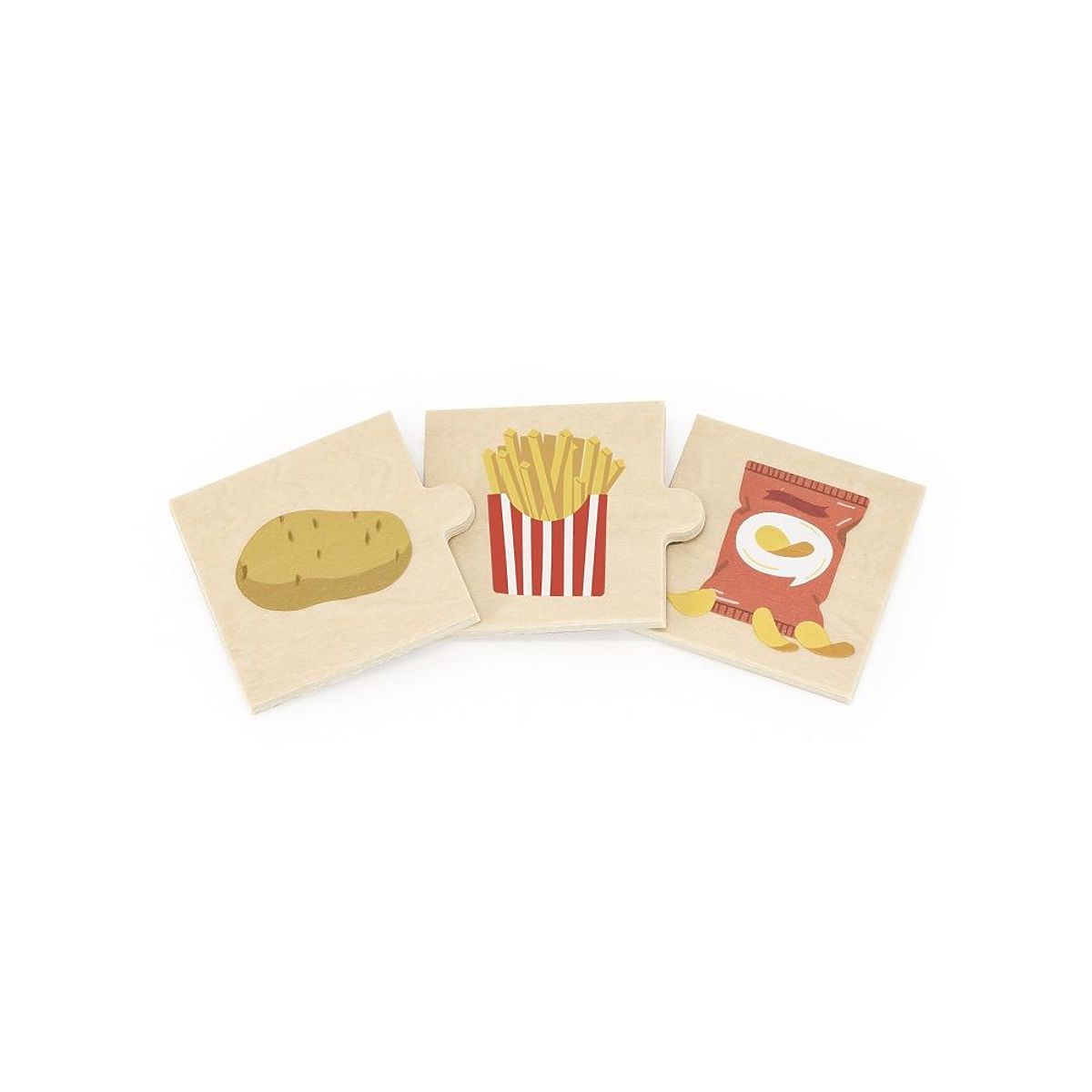 Ein Holzpuzzle in Form eines Puzzles lehrt die kleinsten Kinder die Beziehung zwischen Lebensmitteln und den Pflanzen, aus denen sie stammen. Durch das Zuordnen von Obst, Gemüse und Ernte zu Produkten wie Popcorn, Müsli, Erdnussbutter oder Nudeln entdecken Kinder, woher diese alltäglichen Leckereien kommen. Diese Art von Spiel entwickelt das Verständnis für die mit der Lebensmittelproduktion verbundenen Prozesse und ermutigt dazu, die Verarbeitungsstufen der Pflanzen kennenzulernen. Das Puzzle lehrt Konzentration und motorische Fähigkeiten.