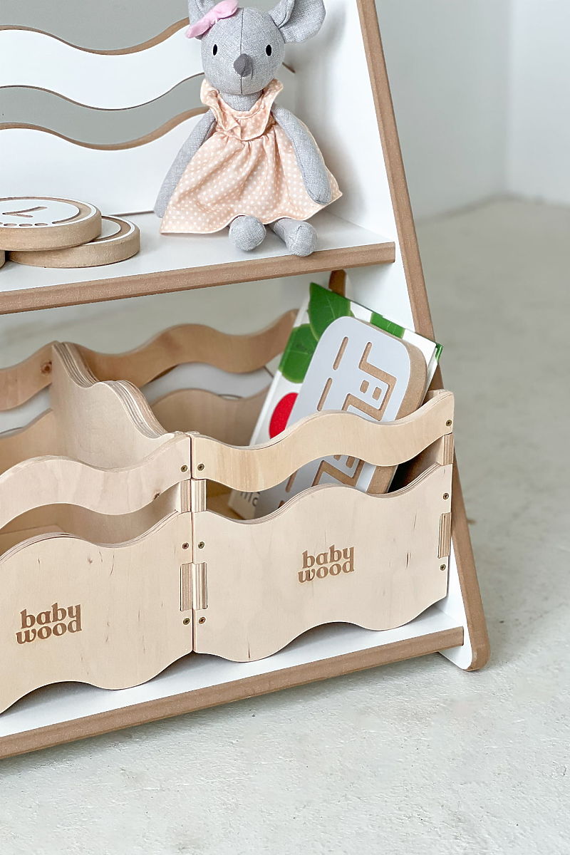 Bücherregal und Regal WAVE M kombiniert zwei Funktionen in einem – der obere Teil dient als Bücherregal und der untere Teil als Stauraum für Spielzeug. Dieses praktische Design ist ideal für Eltern, die alles zusammen haben möchten, ohne zwei separate Möbelstücke zu benötigen. Die gewellten Frontleisten verbinden Funktionalität mit modernem Design – sie sind sicher für Kinder und gleichzeitig stilvoll. Dank der ergonomischen Höhe kann der kleine Benutzer leicht Bücher und Spielzeug erreichen, was die Selbstständigkeit im Sinne von Montessori fördert.