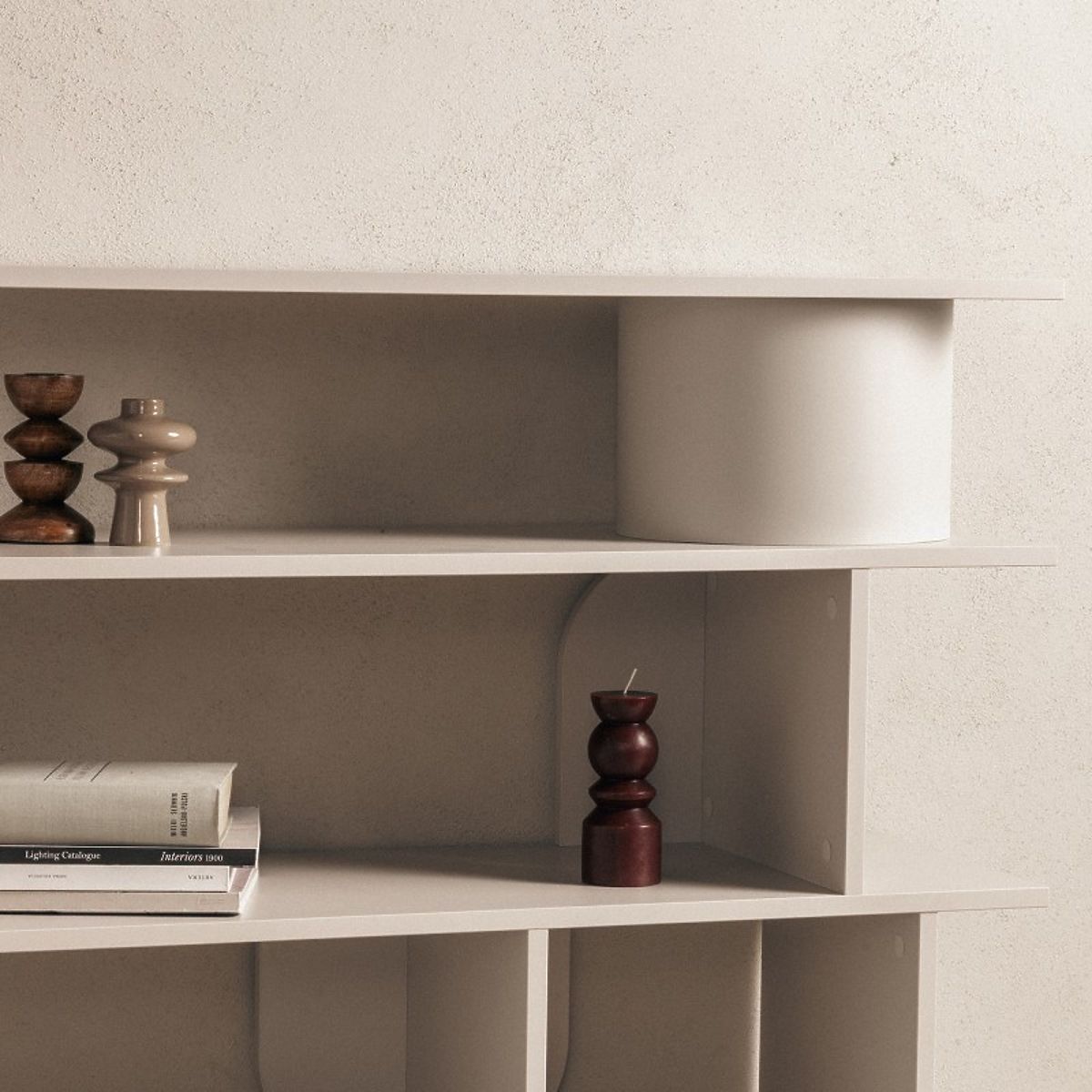 Kaschmirfarbenes Regal mit vier Regalböden und dekorativen Bögen. .. mehr