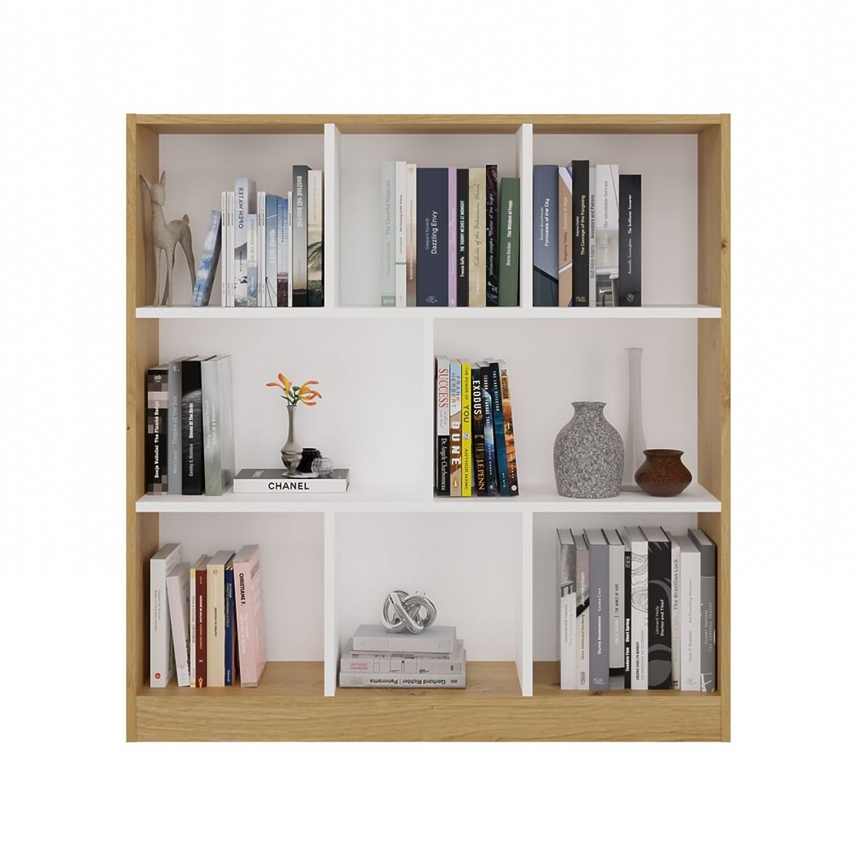Es verfügt über 8 geräumige Fächer, die bei der Organisation des Raumes helfen und eine ästhetische Präsentation Ihrer Lieblingsgegenstände ermöglichen. Die Kombination aus dem warmen Farbton der Eiche Artisan und den kontrastierenden weißen Regalböden verleiht dem Möbelstück einen modernen und eleganten Charakter.