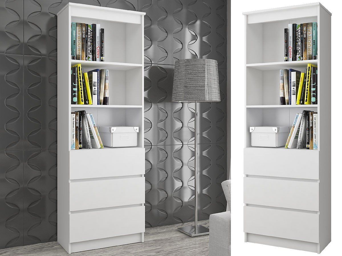 Das Büroregal mit drei Schubladen und zwei Regalböden ist eine praktische und funktionale Ausstattung für jeden Arbeitsbereich. Es kann nicht nur im Büro, sondern auch zu Hause verwendet werden, da die Breite der Regalböden und Schubladen sowie deren optimale Anzahl die Aufbewahrung von Büchern, Dokumenten und anderen Kleinigkeiten des täglichen Lebens ermöglicht. Hergestellt aus weiß lackiertem laminiertem Plattenmaterial, ist das Büroregal mit Kanten, die mit ABS-Kante versehen sind, gegen mechanische Beschädigungen und Abrieb resistent, was eine lange Lebensdauer auch bei intensiver Nutzung gewährleistet. Es ist mit höhenverstellbaren Regalböden ausgestattet, was die Platzierung von unterschiedlich großen Accessoires ermöglicht. Kugelführungen der Firma GTV in den Schubladen mit Auszugsperre garantieren eine einfache tägliche Nutzung. Das Regal ist in einer universellen Größe erhältlich, mit einer Höhe von 180 cm, einer Breite von 60 cm und einer Tiefe von 35 cm, was seine Verwendung in verschiedenen Arrangements, sowohl im Büro als auch zu Hause, ermöglicht.