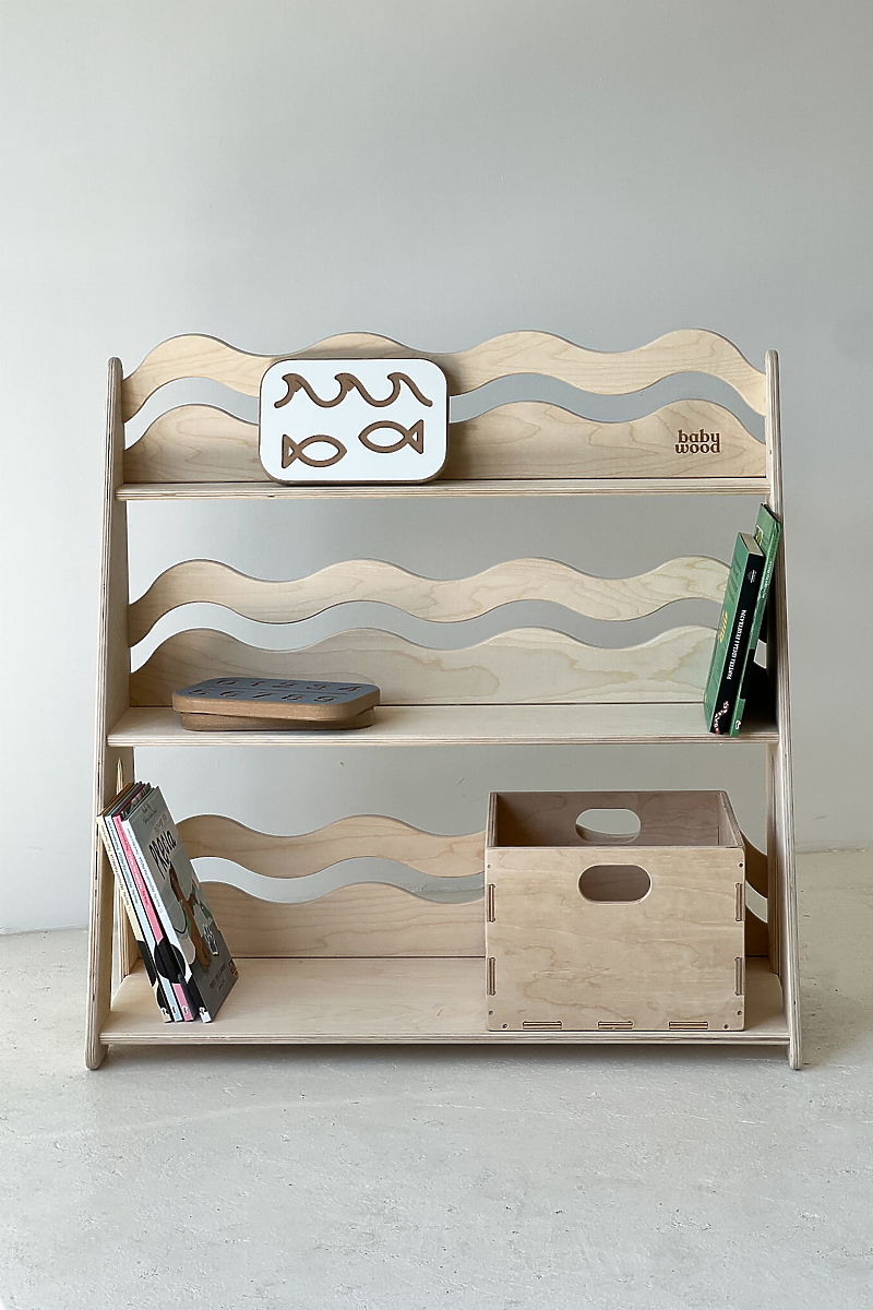 Wandregal WAVE M in Naturfarbe ist ein praktisches und dekoratives Bücherregal für das Kinderzimmer, entworfen im Montessori-Stil. Es hilft dem Kind, Ordnung zu halten und fördert gleichzeitig seine Selbstständigkeit – alles, was das Kind braucht, ist leicht zugänglich, ohne die Hilfe von Erwachsenen. Drei offene Regalböden ermöglichen es, Bücher, Spielzeug und alle kleinen Schätze des Kindes zu verstauen. Die gewellten Frontleisten verleihen dem Regal Leichtigkeit und mildern die einfache Form optisch ab. Natürliche Materialien und sichere Verarbeitung garantieren Stabilität und Langlebigkeit, während sie den Kindern einen sicheren und übersichtlichen Raum zum Spielen bieten.