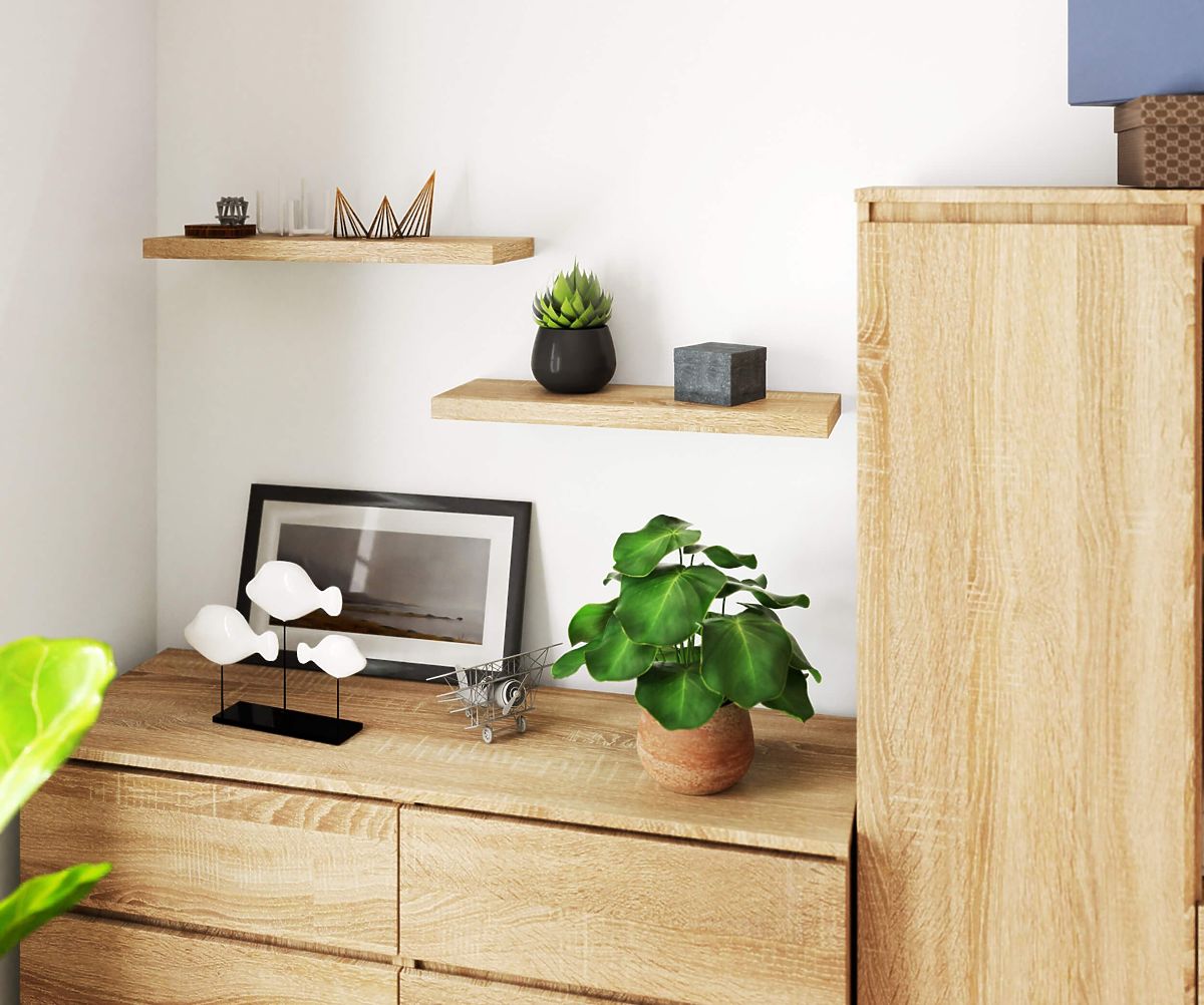 Hergestellt aus abriebfestem laminiertem Plattenmaterial. Die Kanten sind mit Melamin beschichtet. Unsichtbare Wandhalterungen sind im Lieferumfang enthalten.