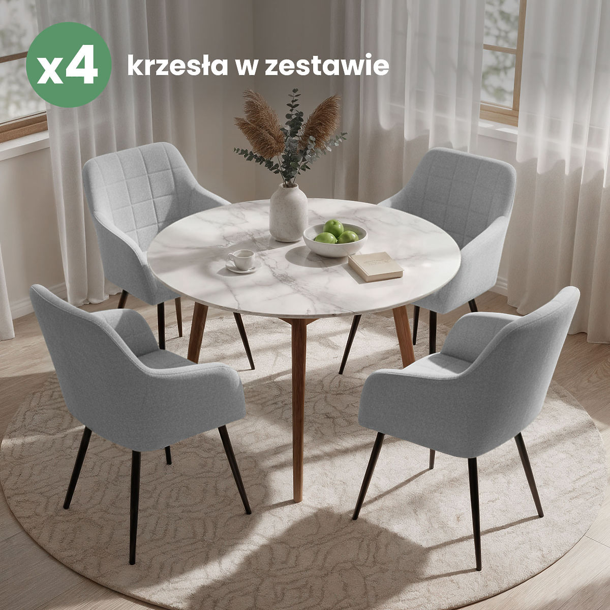 Gepolsterte Stühle verbinden ästhetisches Aussehen mit Nutzungskomfort und passen gut zu verschiedenen Einrichtungsstilen. Ihre universelle Form macht sie geeignet für Esszimmer, Wohnzimmer oder Büroräume. Erhältlich in zwei Materialvarianten – in Lumos-Stoff oder Velours.
