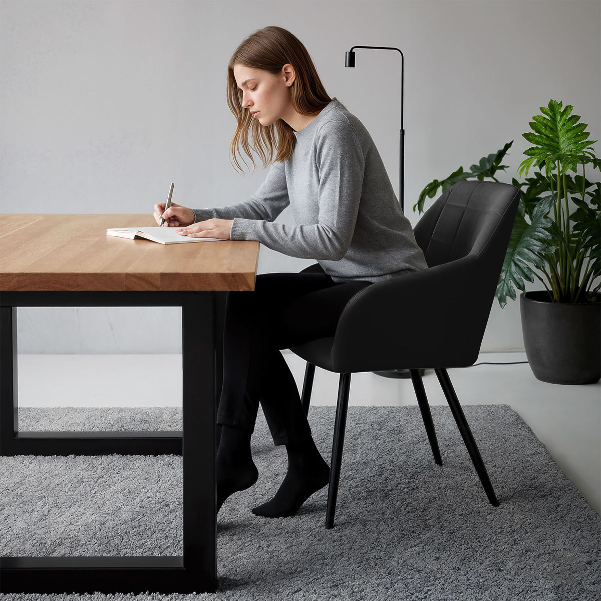 Gepolsterte Stühle kombinieren ästhetisches Aussehen mit Nutzungskomfort und passen gut zu verschiedenen Einrichtungsstilen. Ihre universelle Form macht sie geeignet für Esszimmer, Wohnzimmer oder Büroräume. Erhältlich in zwei Materialvarianten – Lumos-Stoff oder Samt.