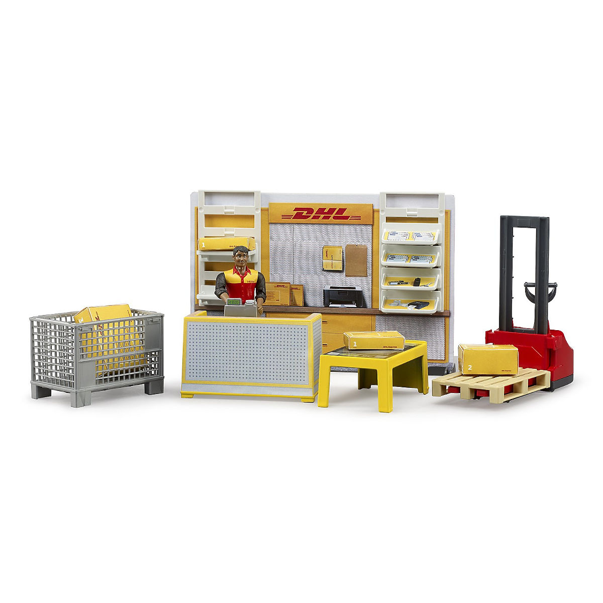In dieser Filiale des weltbekannten Transportunternehmens können Sie Kunden bei der Abgabe oder Abholung ihrer Pakete helfen. Werden Sie die mitgelieferte Figur übernehmen und ein vorbildlicher Mitarbeiter sein? Den Mitarbeitern steht ein Arbeitstresen mit Kasse, ein lenkbarer Palettenhubwagen mit höhenverstellbarer Gabel und viele weitere Zubehörteile zur Verfügung. Das Spielzeug enthält attraktiv bedruckte Kulissen, die das ausgeklügelte variable System BRUDER BWORLD nutzen, das vielfältige Regal- und Hängeelemente für Zubehör und Accessoires umfasst. Schauen Sie sich in unserem Angebot nach passenden Erweiterungen um, insbesondere nach Fahrzeugen, die dem Modellcharakter entsprechen. Hergestellt in Deutschland aus hochwertigen Materialien. Hauptmerkmale: bewegliche Mitarbeiterfigur und lenkbarer Palettenhubwagen, beidseitig bedruckte Kulisse der Paketstation mit 2 Regalteilen, Tresen mit Kasse, Tisch, Paketkorb und 3 Pakete, hergestellt in Deutschland.