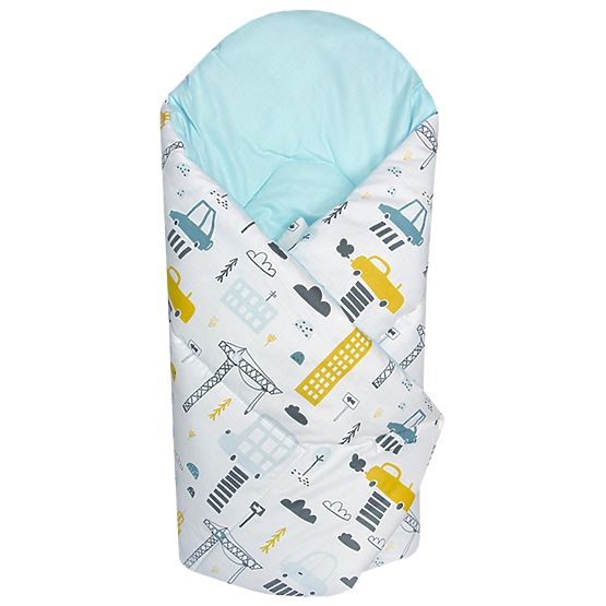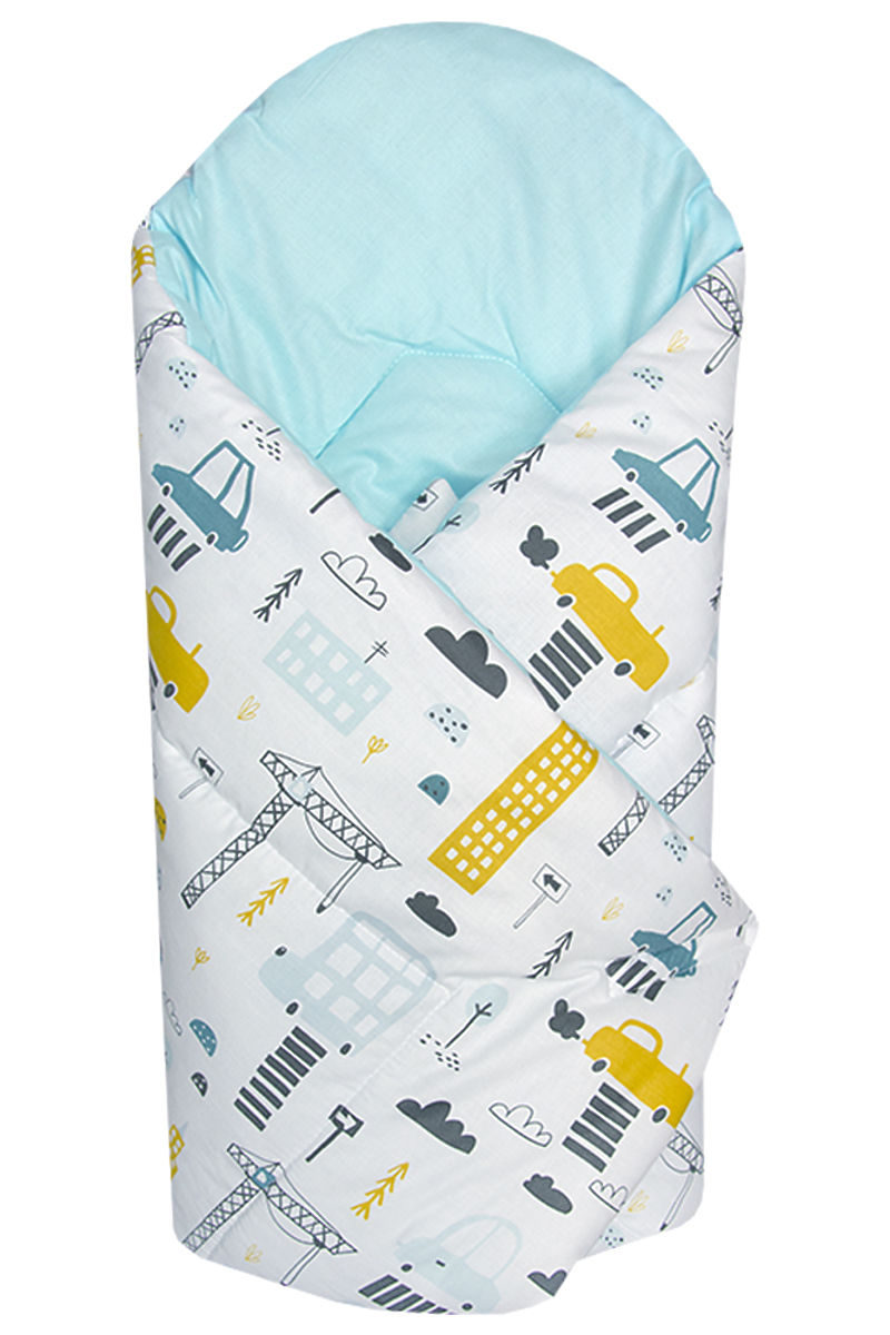 Ein wunderschönes Pucktuch für ein Baby mit Stadtmotiv. Die Kombination der weißen und blauen Farben des Pucktuchs passt wunderbar zusammen. Neben Autos ist die Folie auch mit Motiven von Stadtgebäuden, Autos und Straßen verziert.