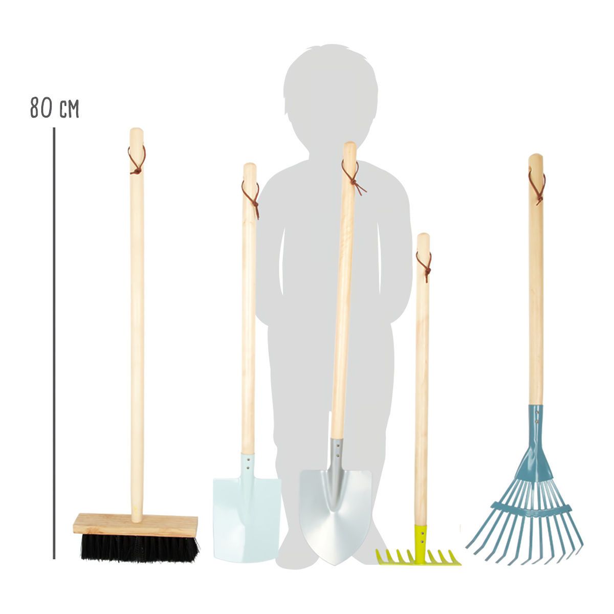 Dieses umfangreiche Gartenwerkzeug-Set in modernen Farben besteht aus einem Spaten, einem Spaten, einem Rechen, einem Besen, einem Spaten und zwei kleinen Gartengeräten für die Gartenarbeit. Nach getaner Arbeit lassen sich die robusten Holz- und Metallwerkzeuge an praktischen Schlaufen fachgerecht aufhängen.