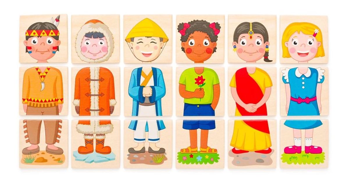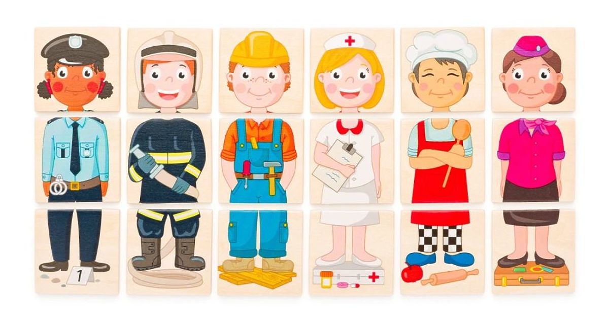 Die Aufgabe des Kindes ist es, eine Figur, die in 3 Teile geteilt ist, so zusammenzusetzen, dass sie der Realität entspricht, oder sie so zu gestalten, dass sie Freude bereitet. Das Kind lernt hier, die verschiedenen kulturellen Traditionen jeder Nation zu erkennen und wahrzunehmen und entdeckt die traditionellen Uniformen jedes Berufs.
