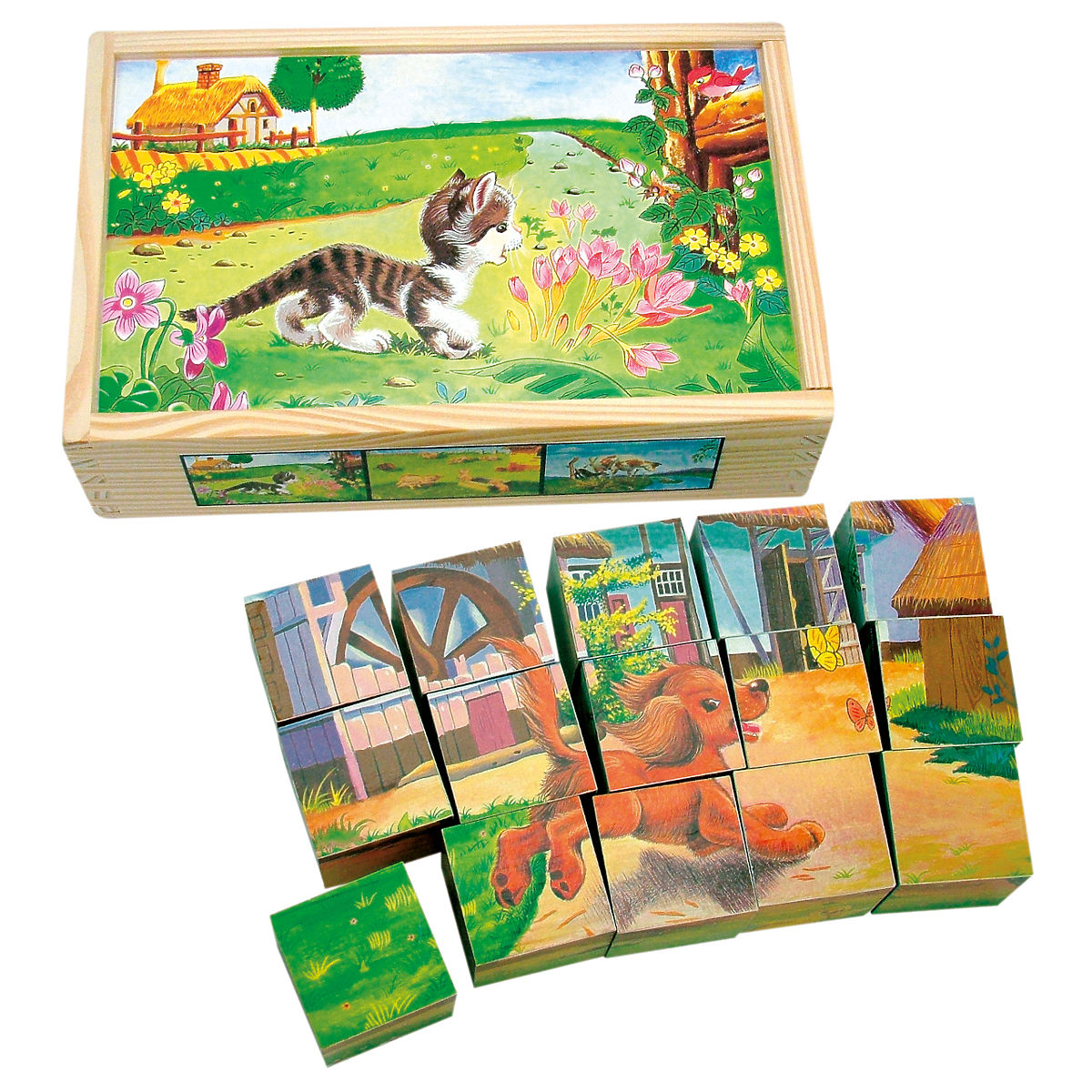 Es gibt nichts Besseres als das klassischste Spielzeug, die Bilderwürfel. Bedruckt mit Szenen aus dem Dorfleben mit Haustieren und Nutztieren. Die Würfel sind .. mehr