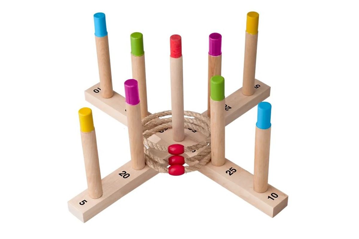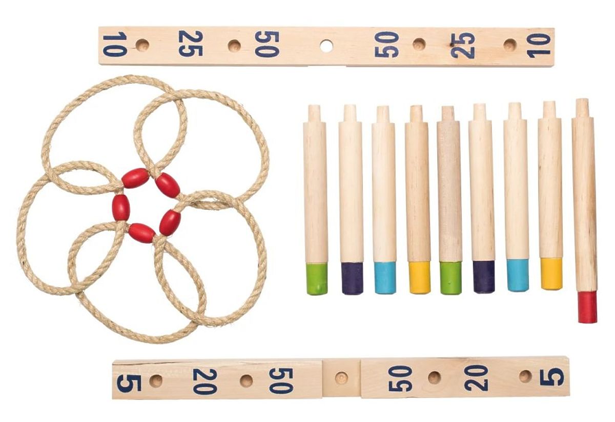 Das Spiel ist aus Holz gefertigt, auf zwei zu einem Kreuz verbundenen Platten befinden sich bunte Holzstifte mit markierten Punktzahlen. Wir zielen mit Ringen aus Seil darauf, und wenn wir den Ring auf den entsprechenden Stift werfen, erhalten wir die entsprechende Punktzahl. Das Spiel kann gleichzeitig von zwei bis acht Personen gespielt werden.