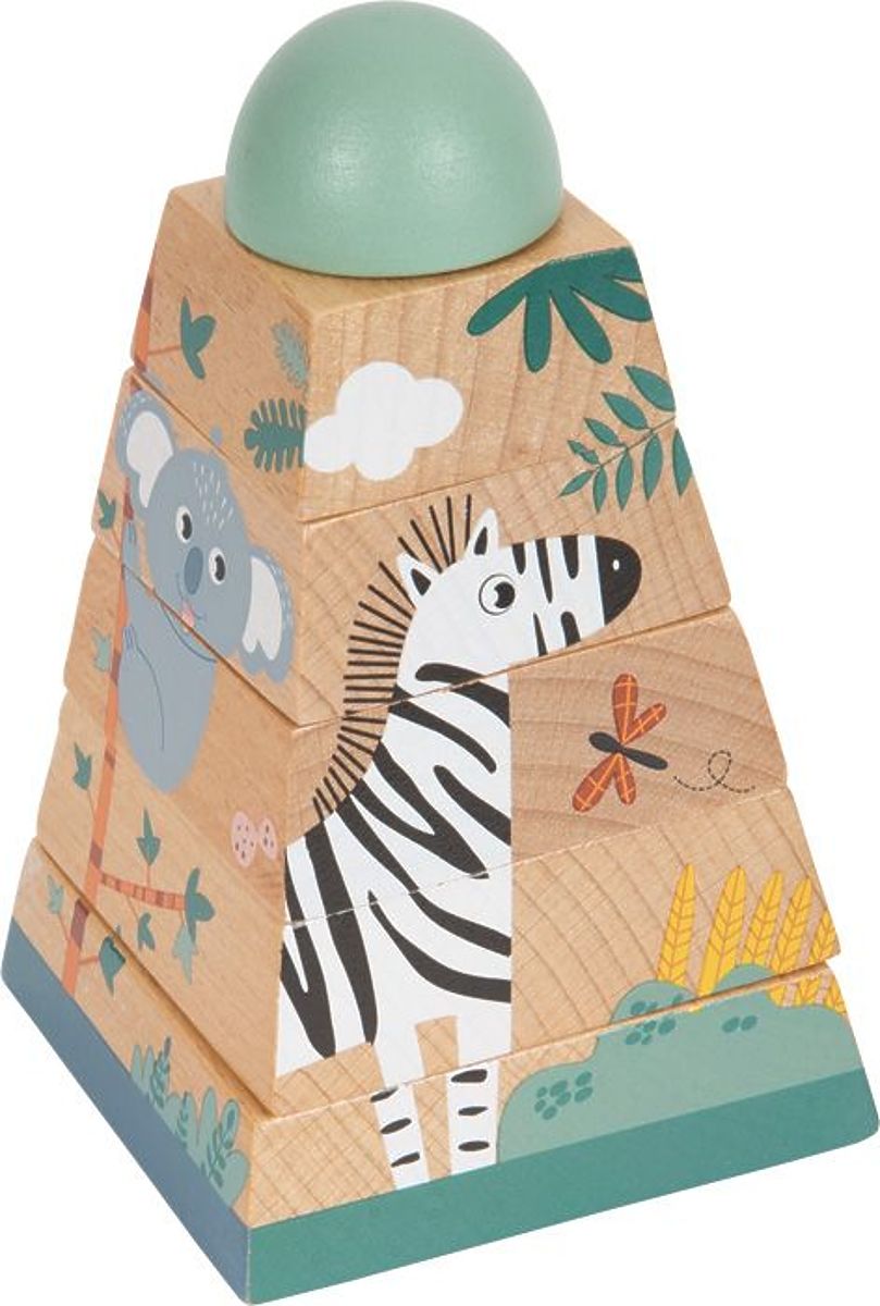 Die stapelbare Pyramide ist ein klassisches Spielzeug aus unserer Kindheit. Diesmal im Safari-Tiermotiv, von dem anerkannten deutschen Spielzeughersteller Small Foot Design.