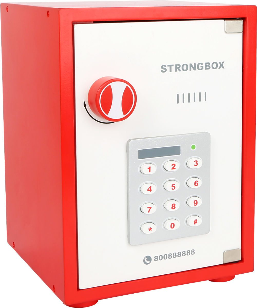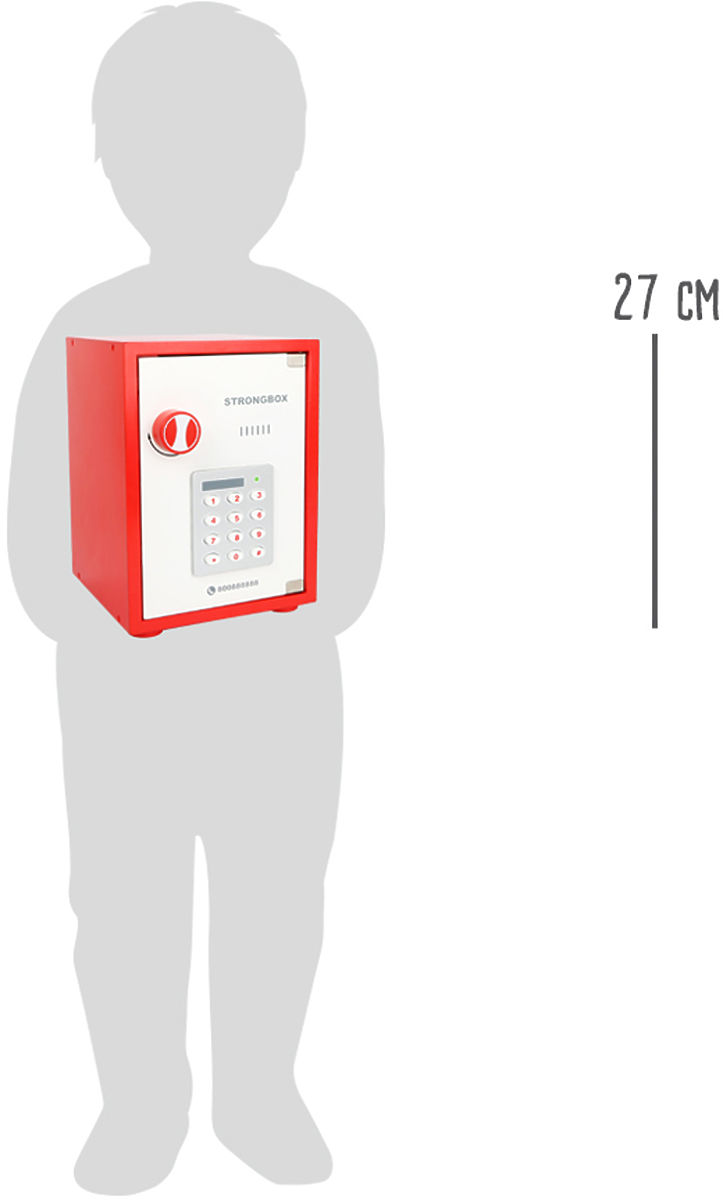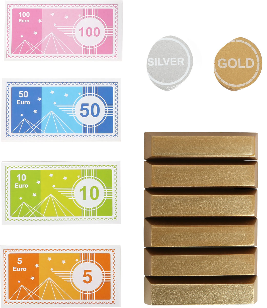Banker und Räuber, aufgepasst! Dieser hölzerne Tresor ist wirklich etwas Besonderes! Bei der richtigen Kombination öffnet sich der Tresor und enthüllt seine Geheimnisse – Euro-Banknoten, goldene und silberne Münzen, aber auch Goldbarren (aus Holz gefertigt). Das Drehschloss macht ein Geräusch und die Tasten lassen sich drücken. Hauptmerkmale: enthält 68 Zubehörteile, drehbares klickendes Ziffernblatt und drückbare Tasten zur Codeeingabe, geeignet für Rollenspiele oder zur Aufbewahrung eigener kleiner Schätze