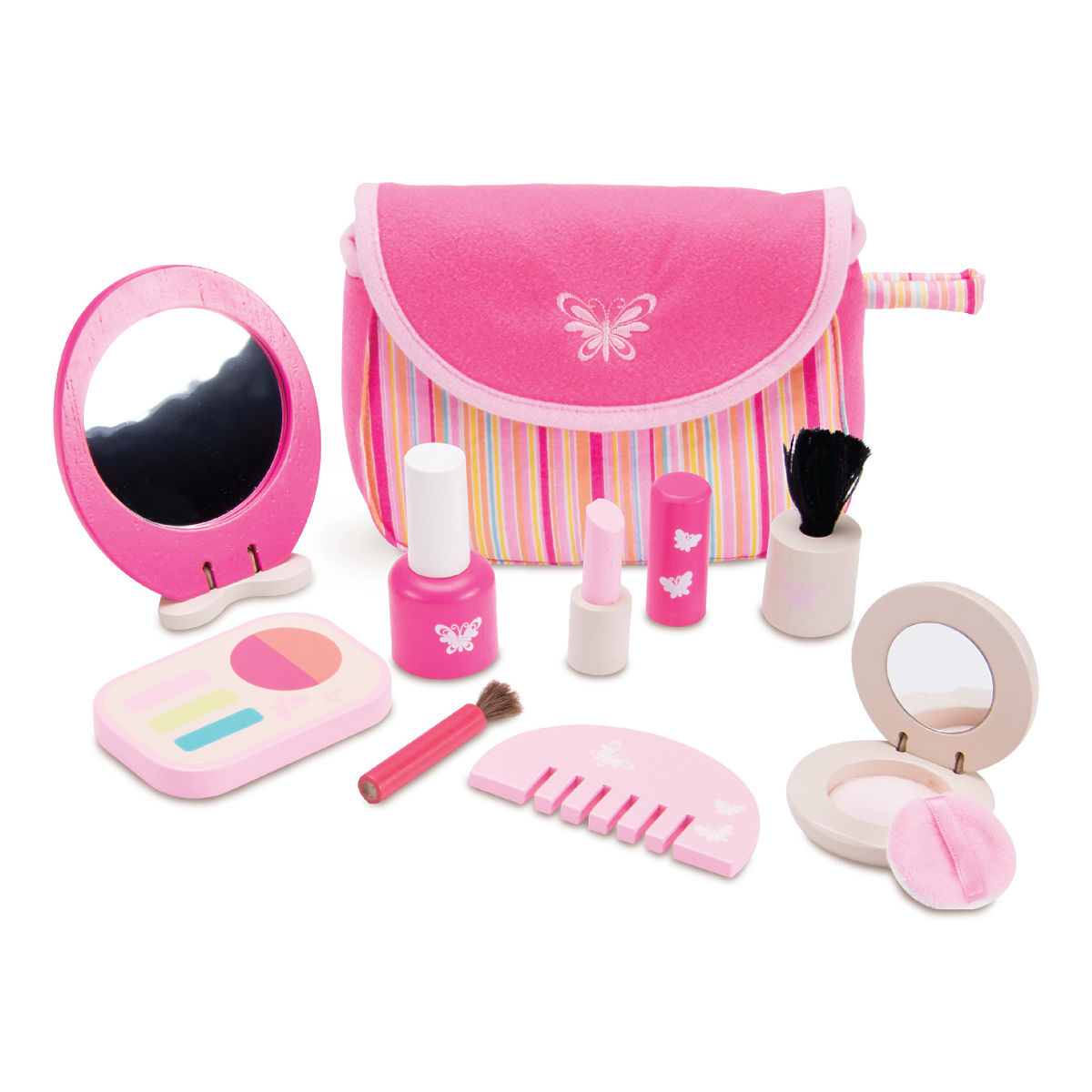 Dieses rosa Schminkset begeistert jedes Kind, das sich gerne stylt. Mit diesem kompakten, aber reichhaltigen Set ist das Schminken und Nachahmen ihrer Lieblingsidole ein Kinderspiel. Kinder können auf spielerische Weise gesellschaftliche Umgangsformen und Fähigkeiten erlernen. Alle Schminkutensilien sind in einer originellen, niedlich gestreiften Tasche mit einem Schmetterlingssymbol verstaut. Die Teile sind aus robustem Massivholz gefertigt und ermöglichen eine einfache Handhabung mit kleinen Kinderhänden. Hauptmerkmale: Tasche, Spiegel, Kamm, Puderbox, Palette, Lippenstift, Nagellack und 2 Pinsel praktische und kompakte Verpackung robustes Holzdesign