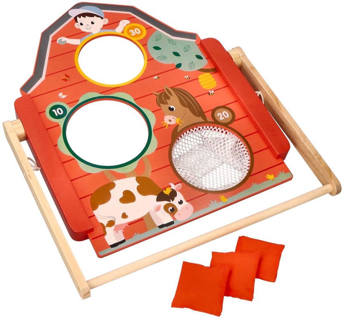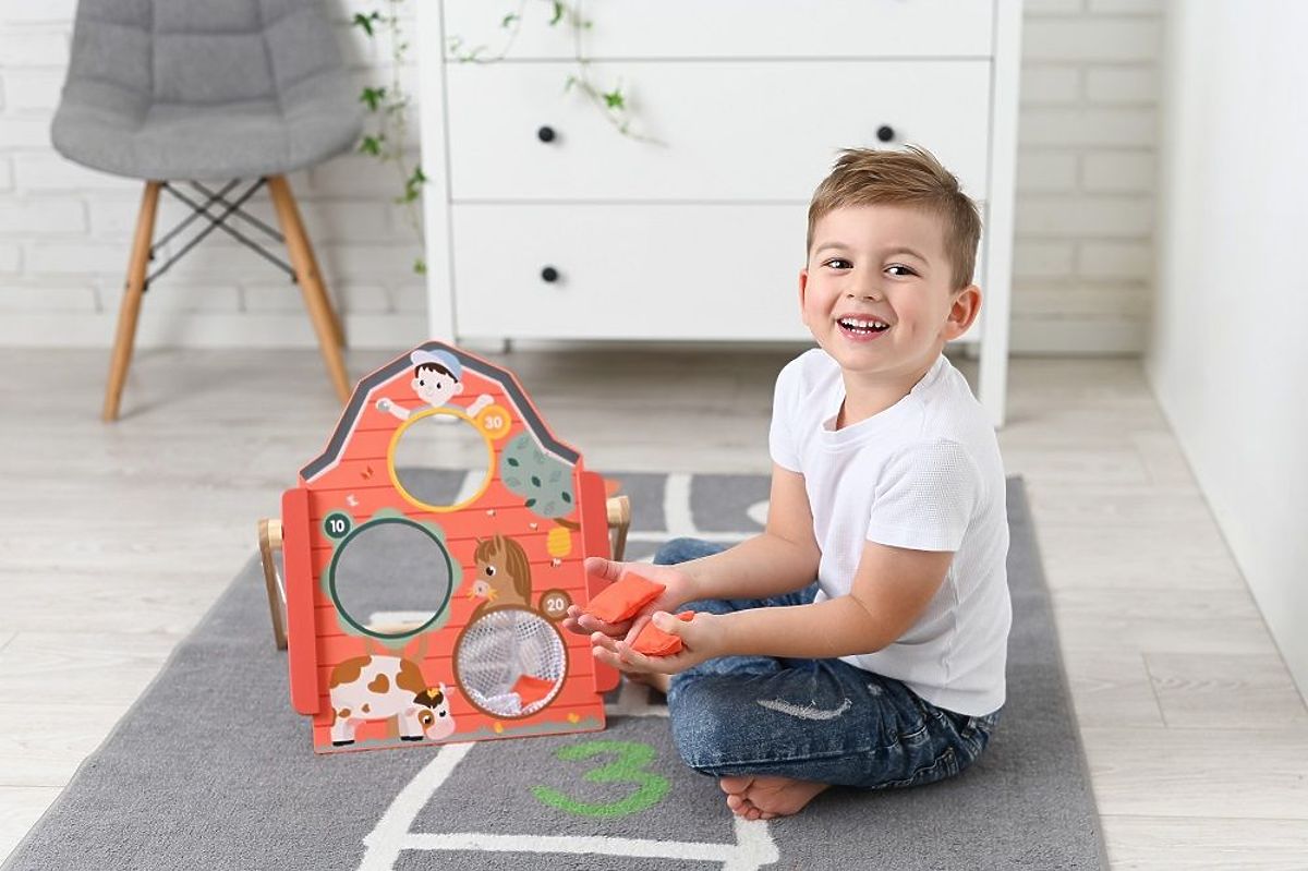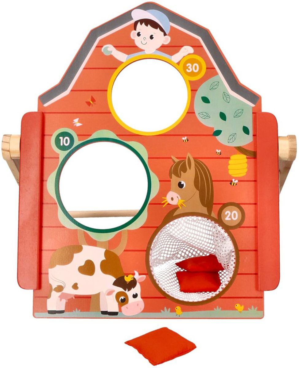 Bewegungs- und Geschicklichkeitsspiele sind eine großartige Möglichkeit, Kinder zur körperlichen Aktivität zu ermutigen. Durch das Anregen der Kinder zum Spielen und Bewegen entwickeln sie sich gesund und arbeiten an ihrer Beweglichkeit. Ein unbestreitbarer Vorteil dieses Spiels ist, dass es sowohl drinnen als auch draußen geeignet ist. Das aus Holz gefertigte Brett mit Bauernhoftiermotiven wird den Kindern sicherlich gefallen und sie zu präzisen Würfen motivieren.