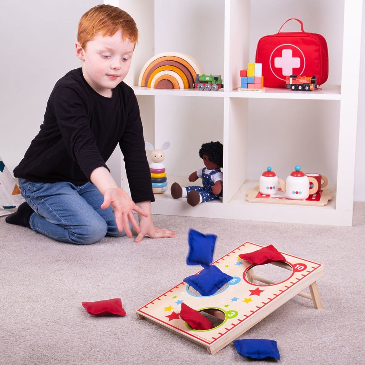 Ein unterhaltsames klassisches Spiel für Menschen jeden Alters! Werfen Sie die Kissen durch die Löcher und sammeln Sie Punkte. Spielen Sie alleine oder in Teams.
