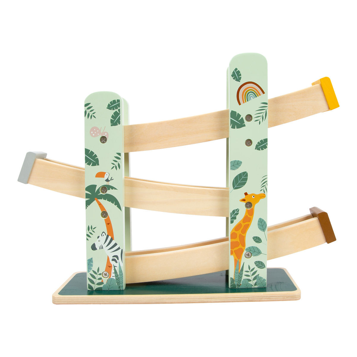 Sie rollen durch die Natur und nehmen Fahrt auf. Drei Holzräder mit unterschiedlichen Illustrationen und Mustern rollen drei Rampen hinunter. Die Strecke ist mit Illustrationen von Safaritieren und Dschungelpflanzen dekoriert. Ein schönes Spielzeug, das langanhaltenden Spielspaß verspricht. Hauptmerkmale: pastellfarbene Strecke und 3 Walzen