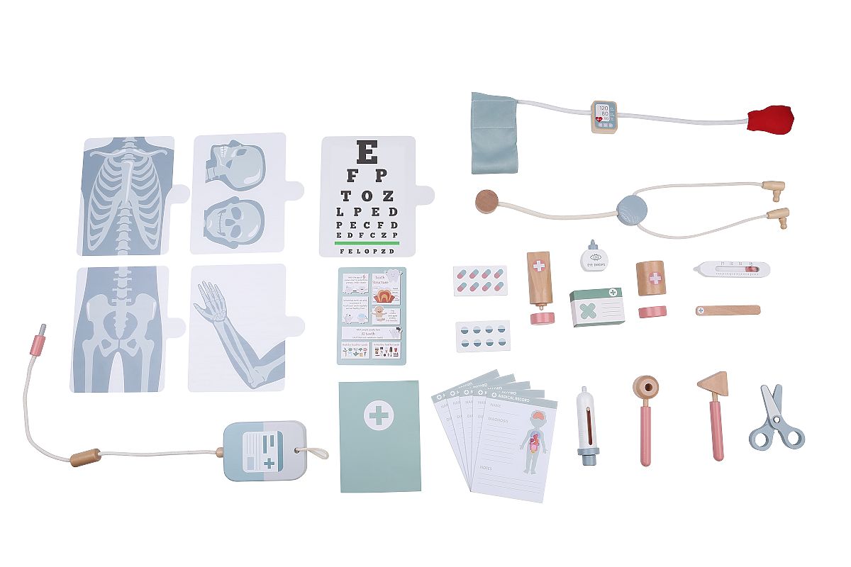 Das Spielen mit diesem Set ist nicht nur ein großer Spaß, sondern auch lehrreich. Kinder lernen Empathie, Überwindung von Ängsten, Verantwortung und Fürsorge für andere. Dieses Spielzeug regt die Fantasie an, ermöglicht es, die Geheimnisse des Arztberufs zu entdecken und die für diese Arbeit notwendigen Werkzeuge zu erkennen. Das Spiel fördert zudem die manuellen Fähigkeiten. Kennen Sie die Größe Ihres Patienten? Nein? Dann messen Sie ihn! Messen Sie auch seinen Blutdruck oder seine Temperatur, hören Sie ihn ab und notieren Sie alles gründlich in der Patientenakte. Sie können auch das Seh- oder Hörvermögen überprüfen und vergessen Sie nicht, die Röntgenbilder auf der funktionalen beleuchteten Tafel anzusehen! Das Set enthält einen Untersuchungstisch mit Stauraum und die für die Arbeit eines Arztes notwendigen Werkzeuge. Stethoskop, Blutdruckmessgerät, Thermometer, Pinzette, Medikamenten- und Cremedosen, Schere, Infusion, 4 Röntgenbilder, Otoskop, Spritze, Hammer, Patientenakten, Medikamentenkarten, Sehtesttafel und Informationsblätter. Hauptmerkmale: enthält 30 TeileHolzkrankenhaus mit Zubehörhilft bei der Entwicklung von Vorstellungskraft, Sprache und sozialen Fähigkeitenverbessert Kommunikations- und motorische Fähigkeitenentwickelt Fantasie und Kreativitätfunktionale Tafel zur Beleuchtung von Röntgenbildern - 2xAAA Batterien nicht im Lieferumfang enthalten