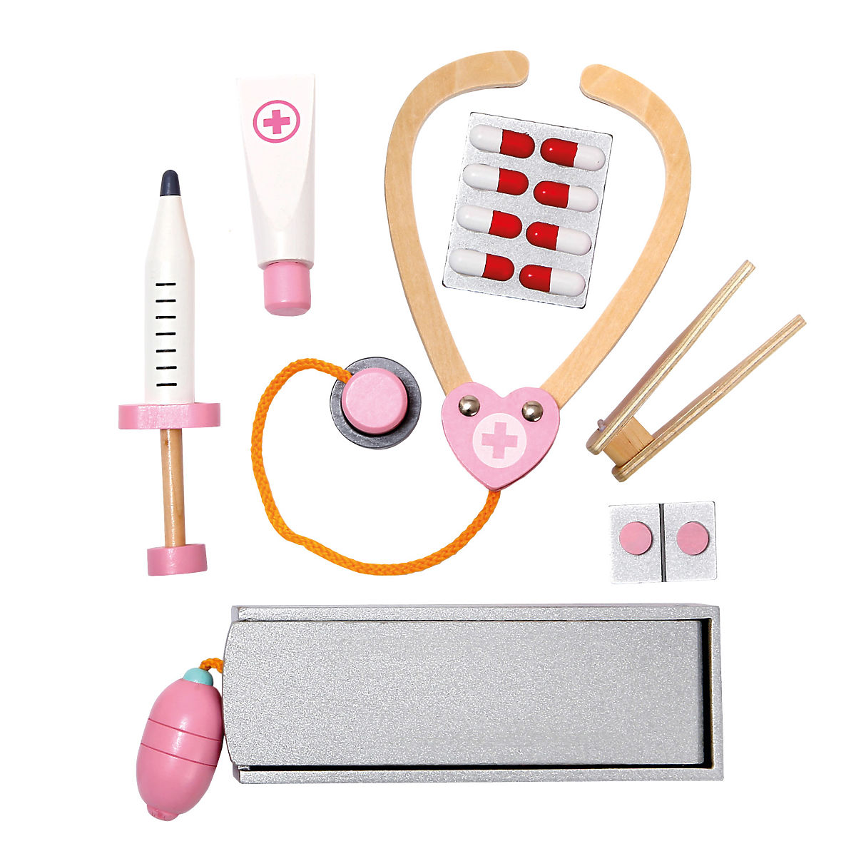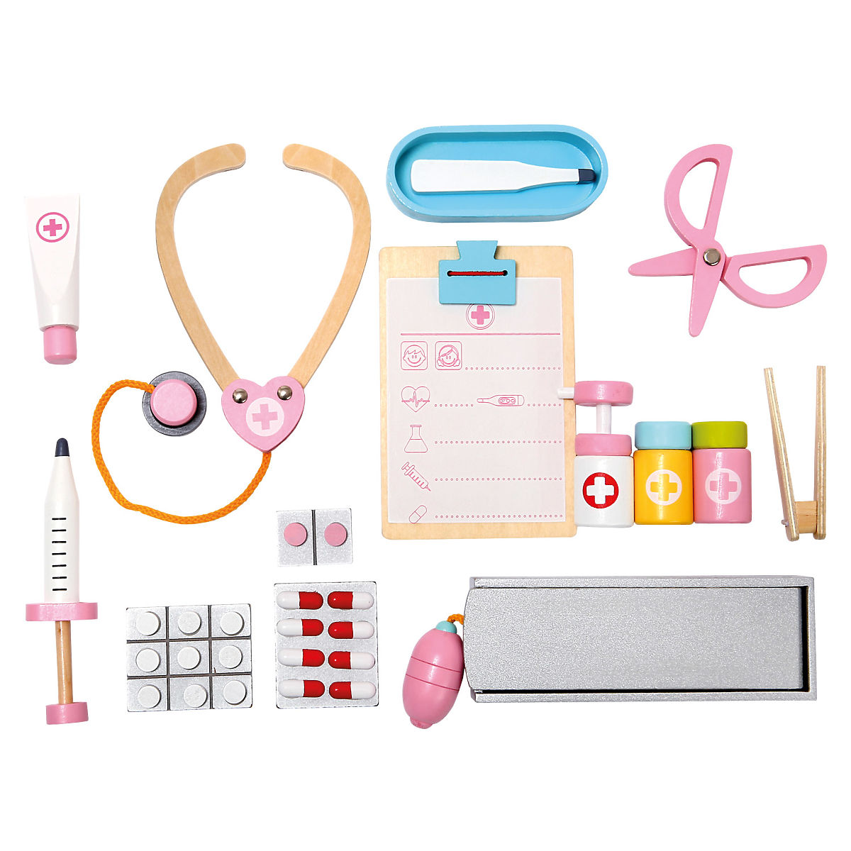 Holz-Arztkoffer für kleine Ärzte. Ideal zum Spielen, bei dem Kinder wirklich lange beschäftigt sind. Sie können die Welt der Erwachsenen erkunden und dabei viel Spaß haben. Kinder können den Koffer leicht selbst öffnen, das benötigte medizinische Zubehör entnehmen und nach dem Spielen wieder einpacken. Das umfangreiche 16-teilige Zubehör ist gut mit breiten Gummibändern gesichert. Auf spielerische Weise trainieren sie Sprachfähigkeiten, Feinmotorik und fördern ihre Vorstellungskraft. Der Kinderspaß hilft, die Angst und Sorgen vor einem Arztbesuch zu verringern. Hinweis: Verwendung durch Kinder unter 3 Jahren nur unter Aufsicht eines Erwachsenen. Hauptmerkmale: umfangreiches 16-teiliges Zubehör, Kinder trainieren Feinmotorik beim Spielen, fördern die Vorstellungskraft, hilft die Angst vor einem Arztbesuch zu verringern, geeignet für Kinder ab 3 Jahren