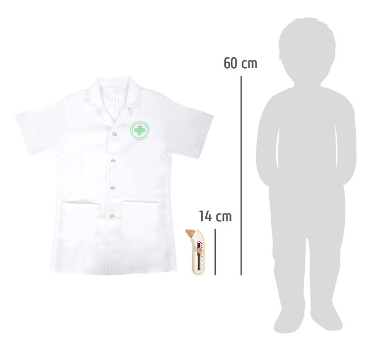 Komplettes Spielset mit Arztkittel und medizinischem Zubehör. Enthält eine Spritze, ein Stethoskop und ein Thermometer aus robustem Holz. Der Kolben der Spritze zieht sich beim Drücken zurück. Das Thermometer hat einen einstellbaren Temperaturanzeiger. Der Arztkittel verfügt über zwei praktische Taschen und wird mit Druckknöpfen geschlossen, sodass junge Mediziner ihn schnell an- und ausziehen können. Perfektes Spielzeug für Rollenspiele oder als Kostüm für den Karneval. Geeignet für Kinder mit einer Körpergröße von 105-110 cm (Größe 110). Ideale Ergänzung zur Arzttasche und anderen ähnlichen Produkten. Hauptmerkmale: Arztkittel und weiteres Zubehör für Kinder mit einer Körpergröße von 105-110 cm, perfekt für Rollenspiele oder Karneval.