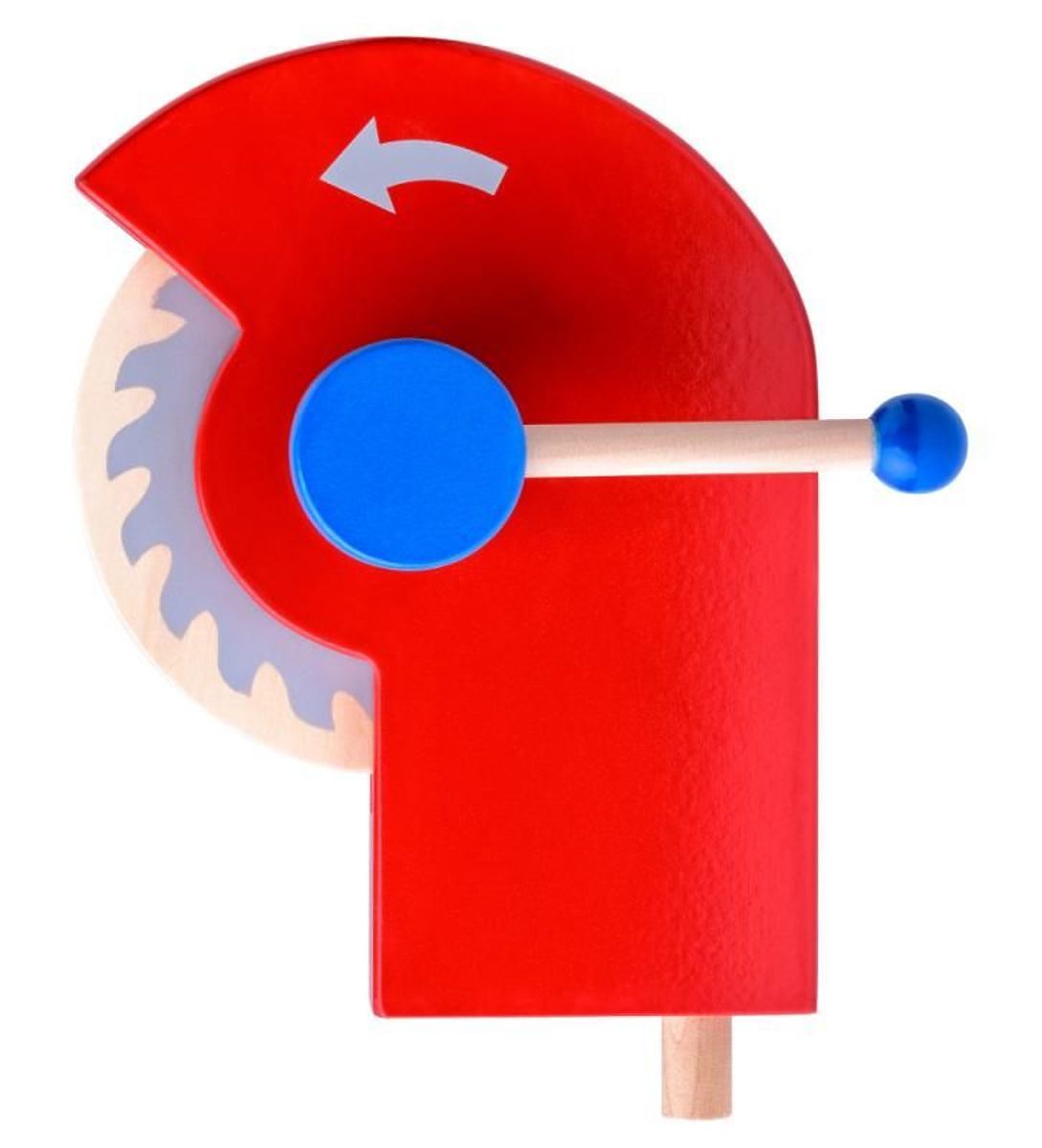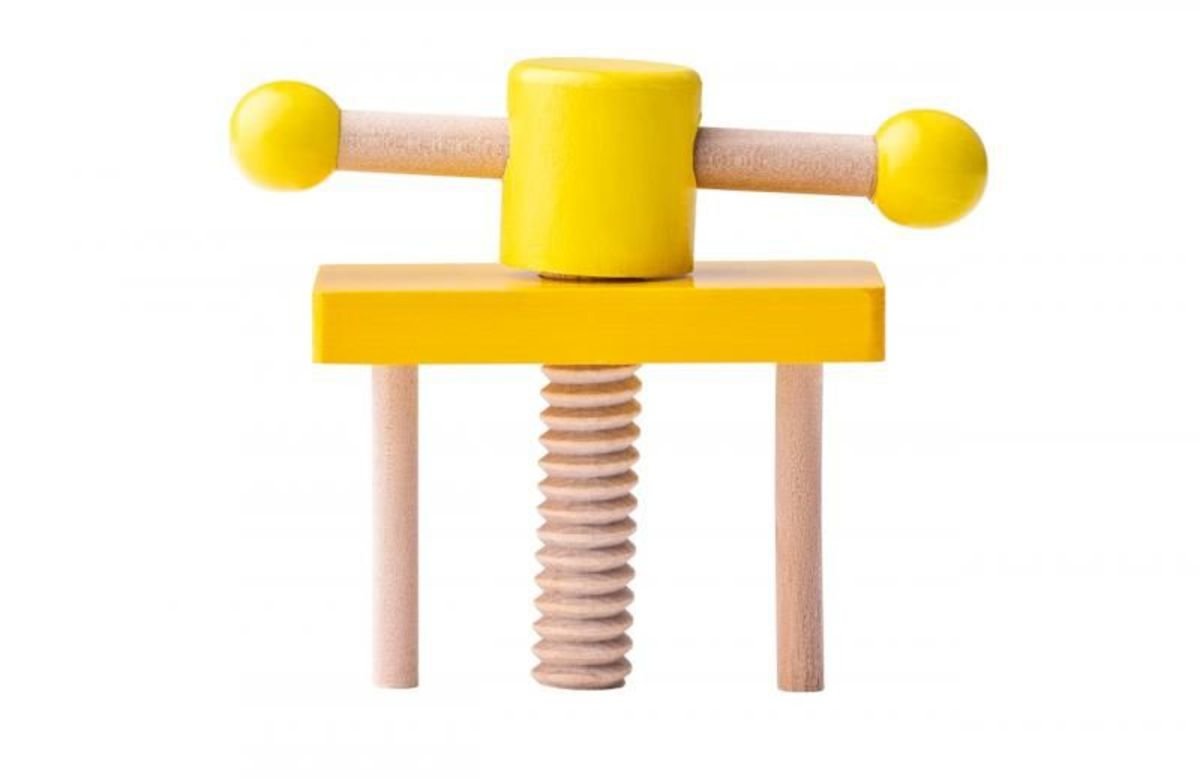 Der Aufbau der Werkstatt besteht aus der Montage der Seitenelemente. Dadurch erhalten Sie einen Griff zum Tragen des Spielzeugs und eine zusätzliche Ablage für Werkzeuge. Eine weitere Attraktion dieses Bausatzes ist der Schraubstock, der von vorne befestigt werden muss, und die Kreissäge, die auf der Tischplatte montiert werden muss. Die Säge hat an der Seite einen Griff zum Drehen, genau wie das Original.