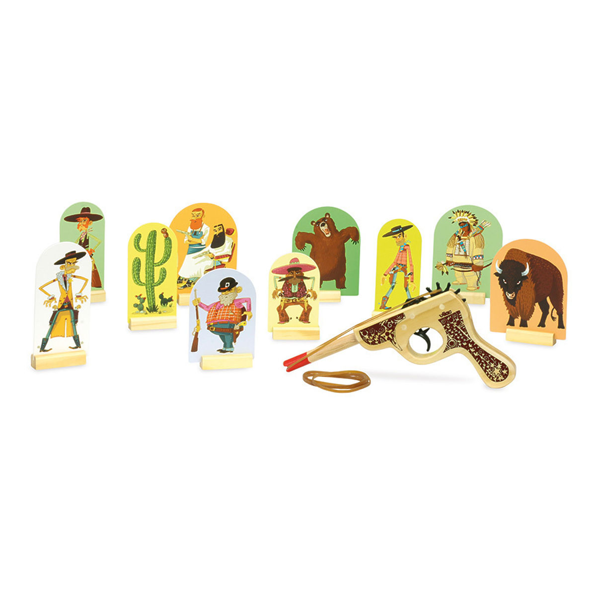 Wilder Westen! Ein Westernspiel, bei dem derjenige gewinnt, der die meisten Ziele abschießt. Einfach das Gummiband über die Holzpistole spannen, Ziele aufstellen und schon kann es losgehen mit dem Schießen. Hauptmerkmale: Trainiert die Genauigkeit