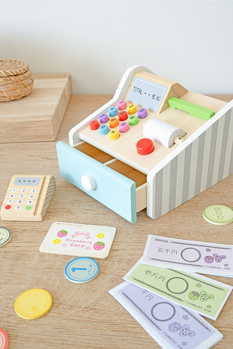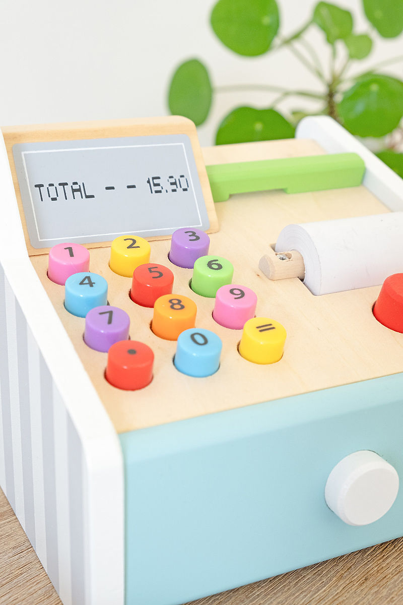 Die Holzkasse Cashy mit Zubehör bietet ganz neue Spielmöglichkeiten. Schlüpfen Sie in die Rolle eines Kassierers und verwandeln Sie das Kinderzimmer in einen Laden, ein Café, einen Friseursalon und mehr. Durch dieses Spiel entwickeln Kinder ihre mathematischen und kommunikativen Fähigkeiten. Die Kasse ist mit einem Terminal, einer Zahlungskarte, einer Quittungsrolle, Banknoten und Münzen ausgestattet.