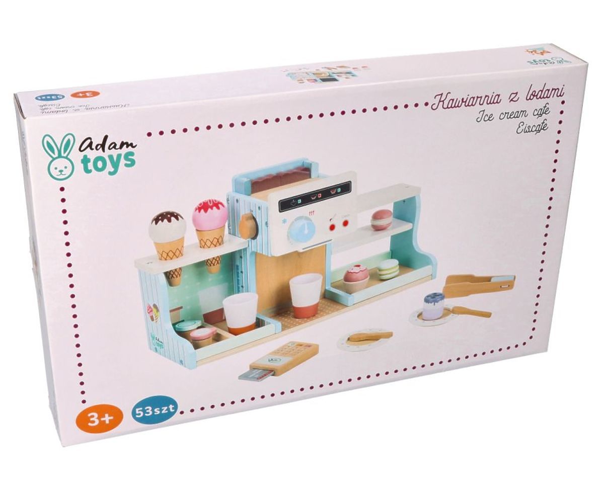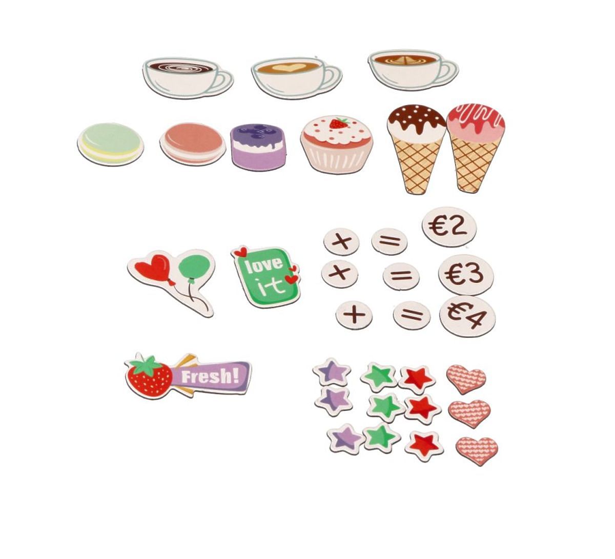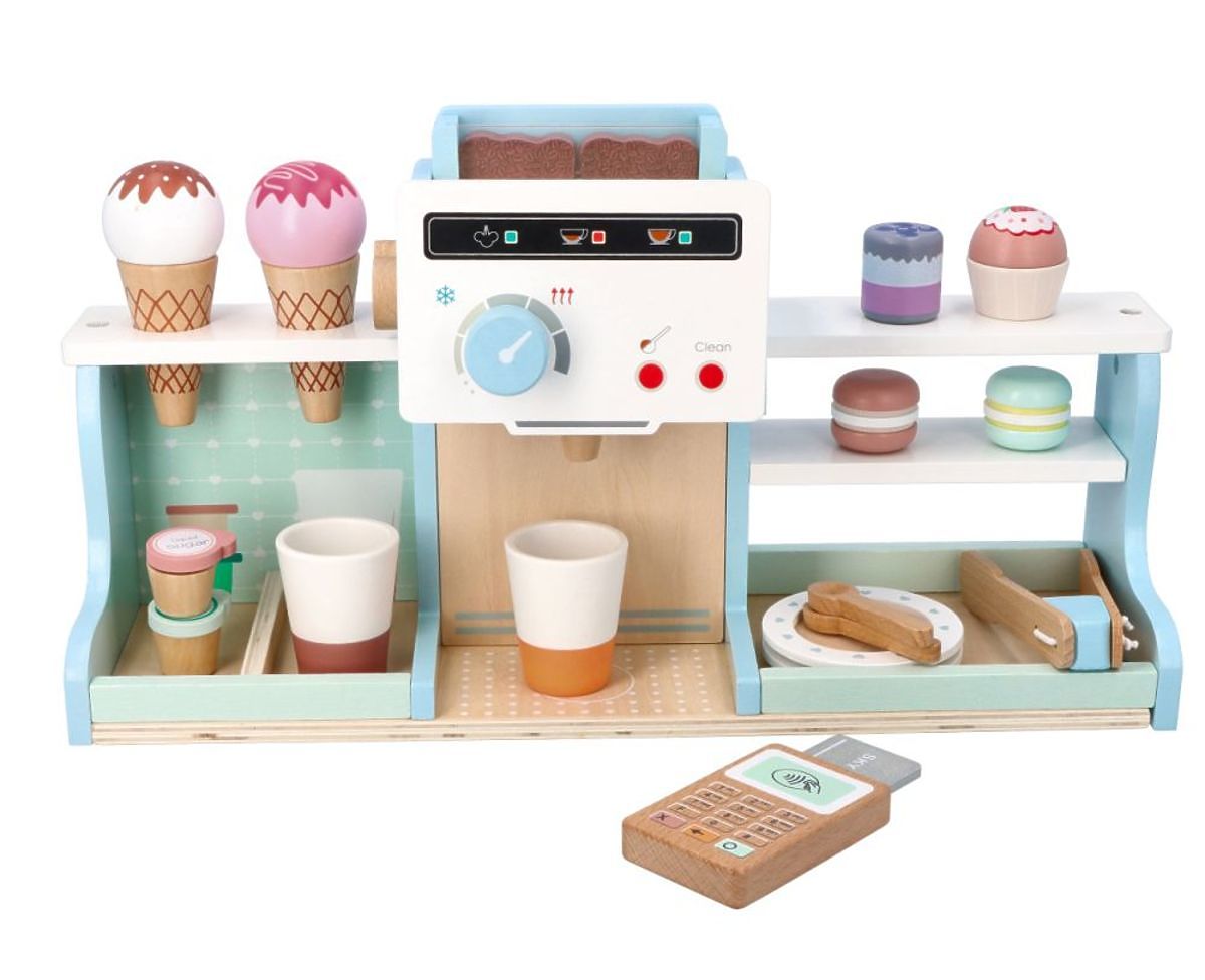 Erwähnenswert ist die Liebe zum Detail, z.B. der Kaffee auf der Oberseite der Kaffeemaschine, das Eis aus zwei Teilen, die Behälter mit Klettverschluss, die geöffnet werden können. Ebenso wichtig ist das Design. Die schöne, sanfte Farbgebung, Streifen und Drucke an den Seiten und im Inneren des Cafés machen dieses Spielzeug außergewöhnlich.