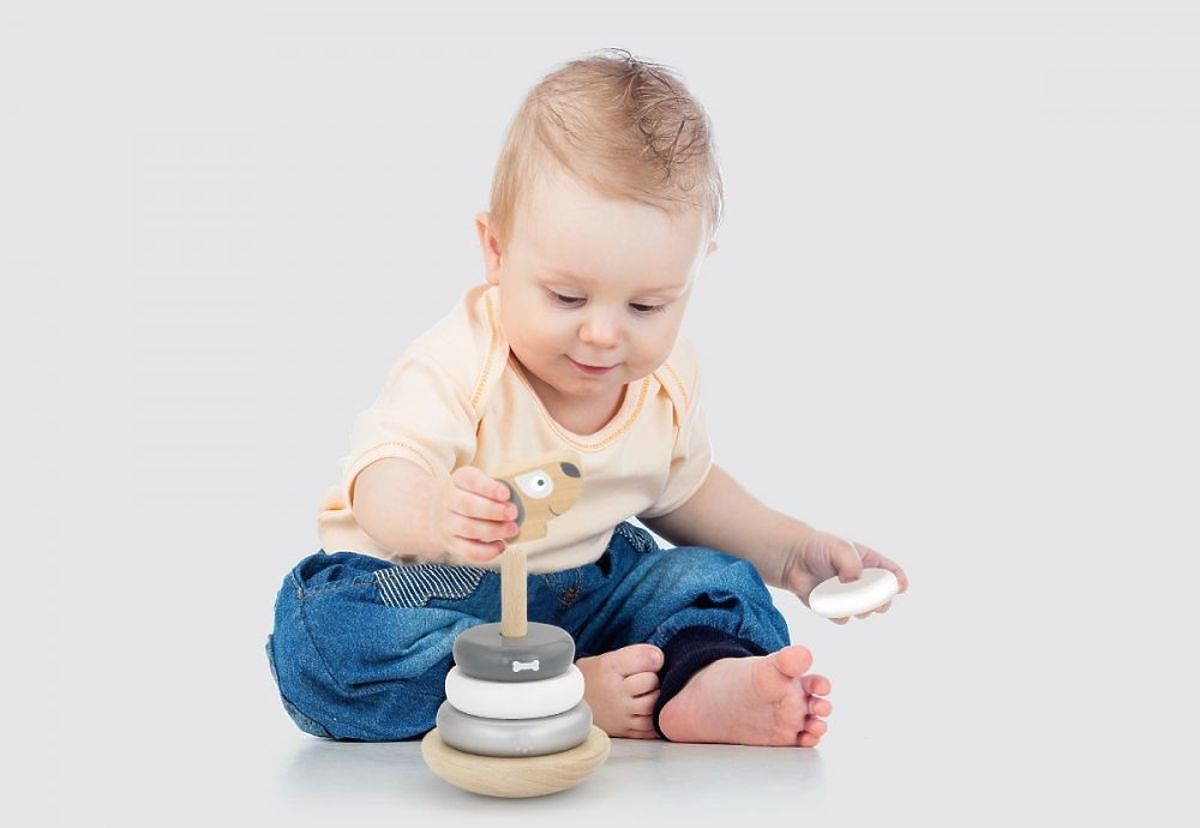 Die Aufgabe des Kindes ist es, Holzringe vom größten zum kleinsten auf einen Stock zu fädeln. Der Sockel hat eine ovale Form und schwankt während des Spiels leicht, was die Aufgabe etwas schwieriger macht.
