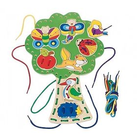 Ein bunter Baum mit ineinander verschlungenen Schnürsenkeln ist ein großartiges Spielzeug, um die Feinmotorik der Kinderhände zu üben.