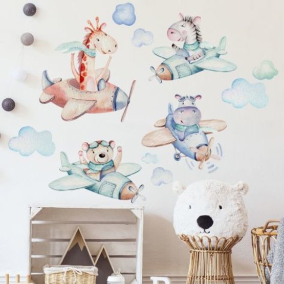Schöner Aufkleber mit einem Motiv von Tierpiloten in Flugzeugen. Giraffe, Zebra, Nilpferd und Kupfer fliegen mit Flugzeugen zwischen den Wolken. Der Aufkleber ist in hellen Pastellfarben gehalten. Beleben Sie das Zimmer Ihres Kindes mit einer niedlichen Wanddekoration. Sie haben die Anordnung der Teile an der Wand in Ihren Händen. Wenn Sie Spaß haben möchten, beziehen Sie Ihre Kinder beim Dekorieren mit ein.