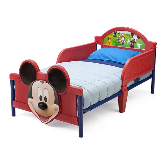 Ein Kinderbett mit Motiv der "Mickey Maus“. Das Bett ist niedrig und daher für Kinder leicht zugänglich. Das Kopf- und Fußende, und die Seitenteile sind aus einem sehr widerstandsfähigen, gehärteten Kunststoff hergestellt. Das Bett hat einen Stahlrahmen, welcher eine ausreichende Stabilität gewährleistet.