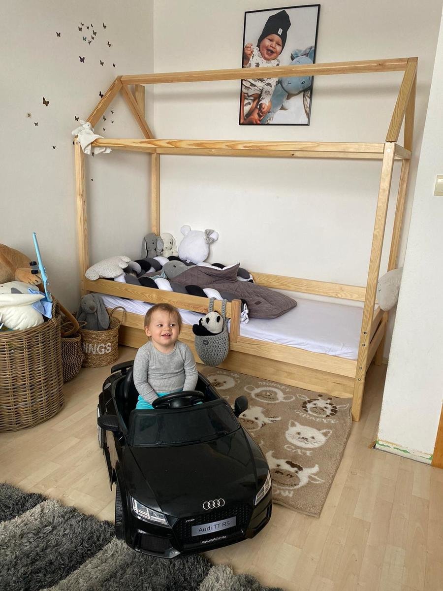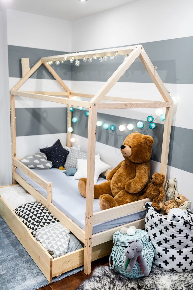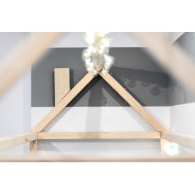 Die Konstruktion des Hauses über dem Bett ist luftig und lädt zum Dekorieren mit verschiedenen Leuchten oder zum Bau einer von Kindern beliebten Höhle ein. Wählen Sie ein Hausbett mit oder ohne Schublade.