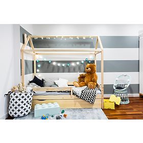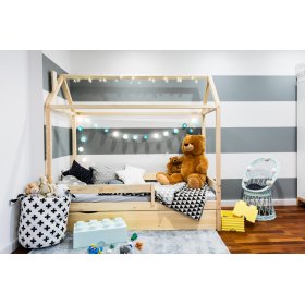 Das Kinderhausbett Paul in natürlicher Farbe, hergestellt aus Kiefernholz. Hausbetten im natürlichen Dekor beeindrucken mit ihrem Aussehen. Das helle massive Kiefernholz ist wie geschaffen für Kinderzimmer im skandinavischen Stil. Zum Hausbett Paul gehören eine Sicherheitsbarriere und ein Holzlattenrost.