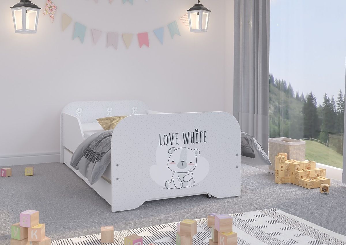 Das Kinderbett Miki mit Sicherheitsbarriere und Druck eines niedlichen weißen Bären in den Maßen 160 x 80 cm. Das Bett enthält zwei seitliche Barrieren und einen Bettrahmen.